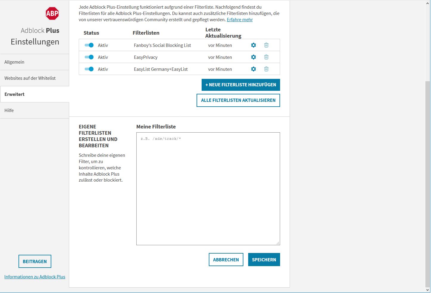 im Rahmen eines Firefox Versionsupdates wurde auch Adblock Plus auf die Version 3.1 geupdated. In der alten Adblockversion hatte ich eine eigene Filterliste erstellt. Die wurde natürlich nicht übernommen. Meine Filterliste liegt mir aber noch vor und möchte diese nun in die neue ABP version einbinden. Das Problem: die Menüführung in den Einstellungen ist in der Version 3.1 eine ganz andere (siehe angehängtes Bild). Es gibt zwar eine Rubrik "Eigene Filterlisten erstellen und bearbeiten", jedoch keine Möglichkeit meine Filterliste einzulesen. Es scheint auch keine Möglichkeit zu geben nach Trefferzeitpunkt usw. zu sortieren. Dies würde das Bearbeiten meiner Filterliste bei Problemen sehr unpraktikabel machen. Die größte Frage für mich ist, wie kann ich meine Filterliste jetzt sichern? Die alte ABP Version hat die Filterlisten sogar autoamatisch gesichert.