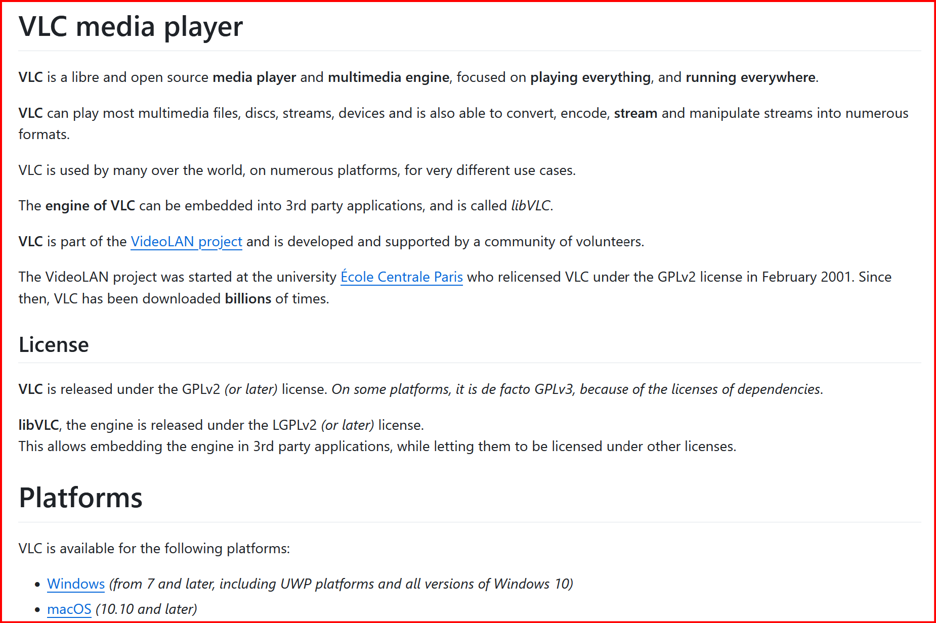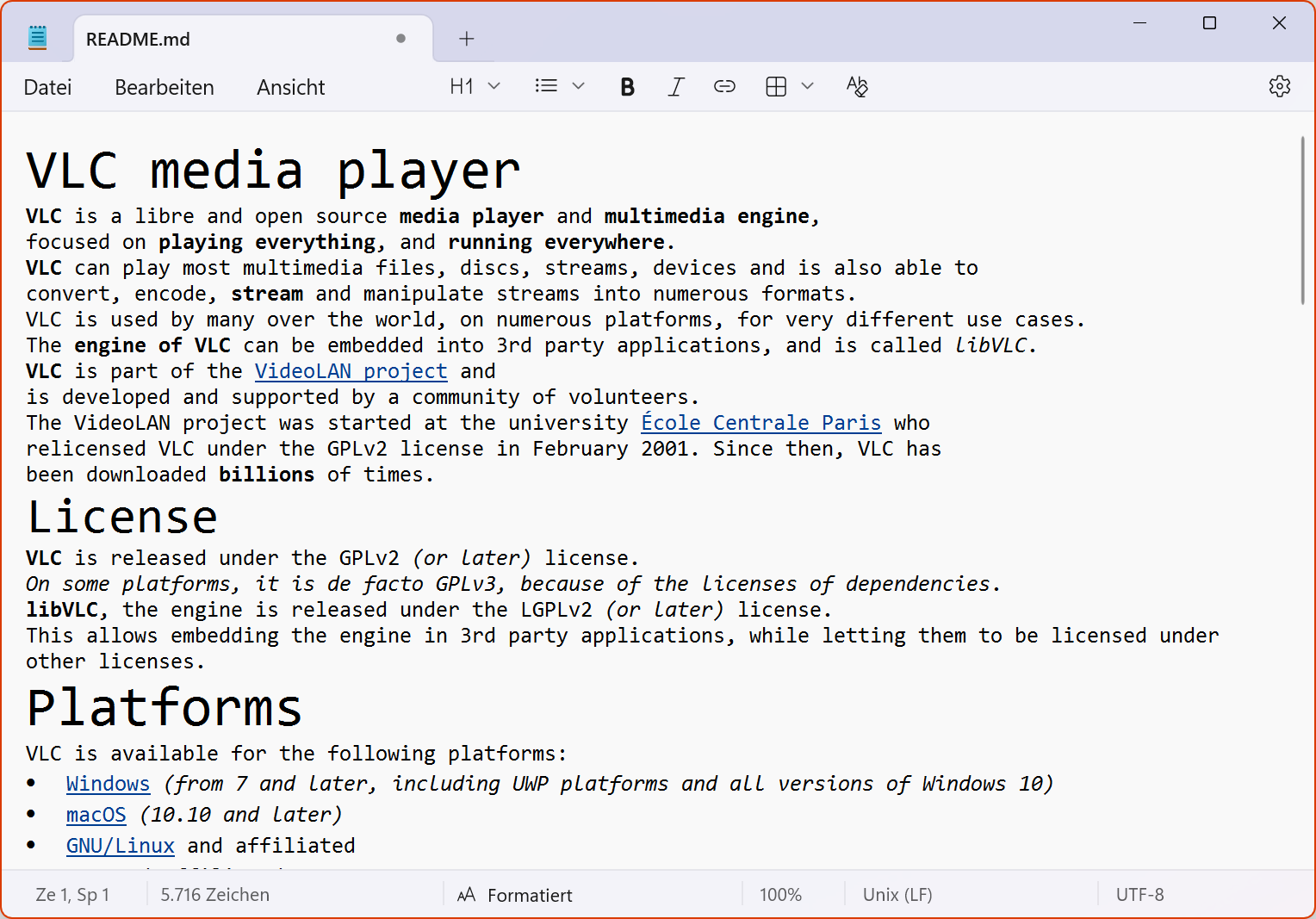 Man nehme z.B. die Readme.md vom VLC Mediaplayer:
