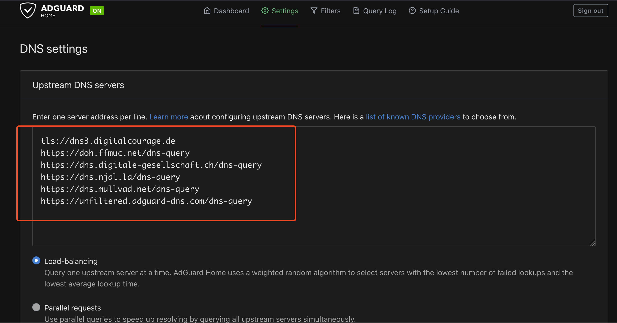 - 6 Upstream DNS Server (5 als DNS over HTTPS, 1 als DNS over TLS) welche die gefilterten Requests der Clients annehmen