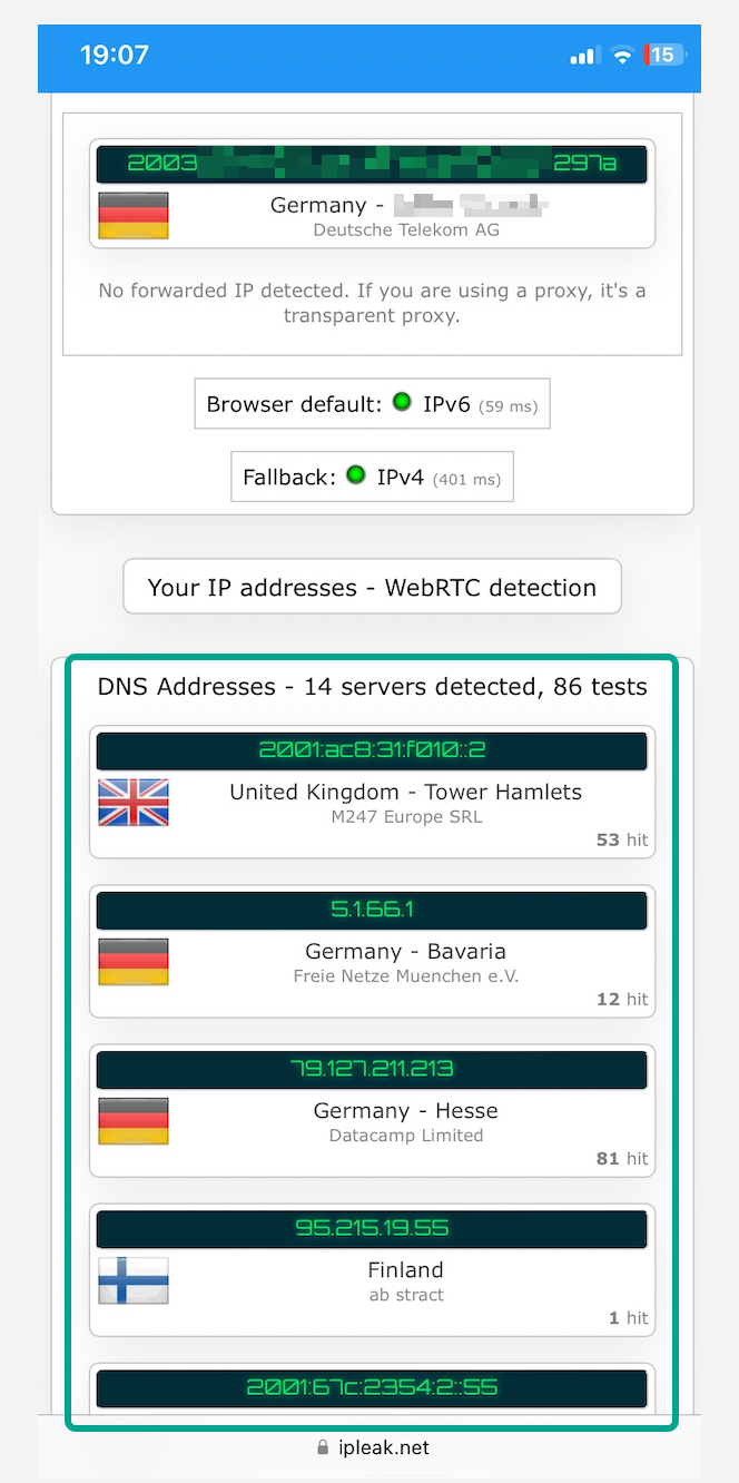 Wenn ich für dieses Beispiel dann einmal kurz die WLAN-Verbindung gekappt und mich neu verbunden hatte, habe ich beim DNS Check auch die "richtigen" Upstream-DNS Server bekommen und das Filtern war OK.