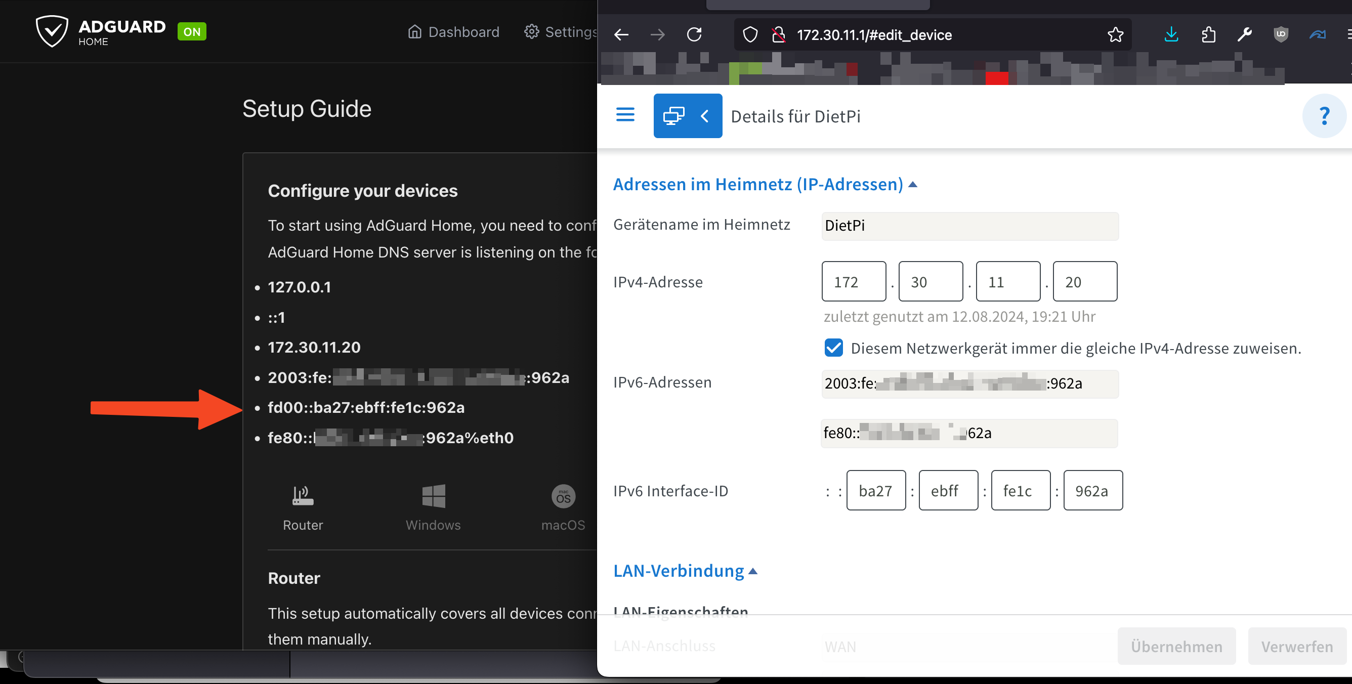 - DNS-Server für lokale Clients im Netzwerk: Raspberry Pi mit DietPi wo AdGuard Home läuft und lauscht (172.30.11.20)