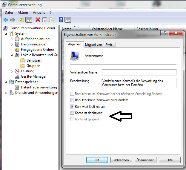 Dann deaktiviere ich den Adminaccount für die Anmeldung, dass meine Bekannten nicht verwirrt sind: