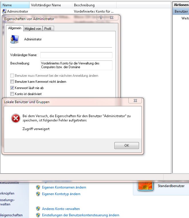 Ich hänge ein Bild an, was ich probiert habe um das Problem nachzustellen. Im Hintergrund ist ein Konto zu sehen, welches nicht auf "Administrator" steht, sondern auf "Standardbenutzer". Gehe ich auf "Kontotyp ändern", geht es nicht weiter, da das nur der Administrator kann. Versuche ich die Deaktivierung des Administrators aufzuheben (das Konto also zu aktivieren), kommt wieder eine Fehlermeldung, siehe Bild.