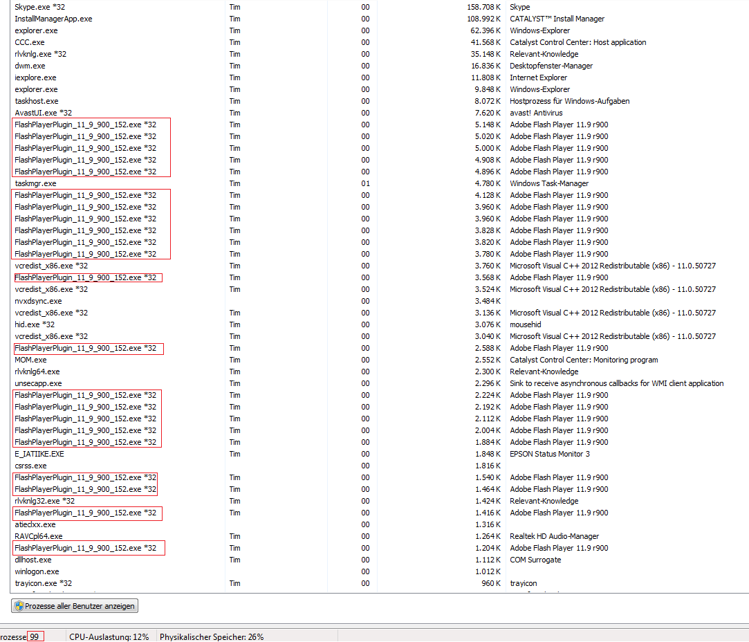 Adobe Flashplayer wird über 10x ausgeführt (im Taskmanager)