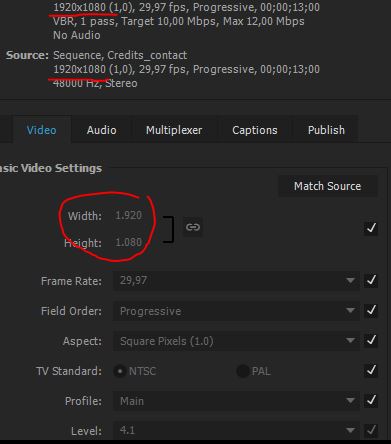 Wenn ich über Premiere, After Effekts oder Media Encoder exportiere, dann sind die settings immer auf export 1920x1080 pixels (Screenshot 1).