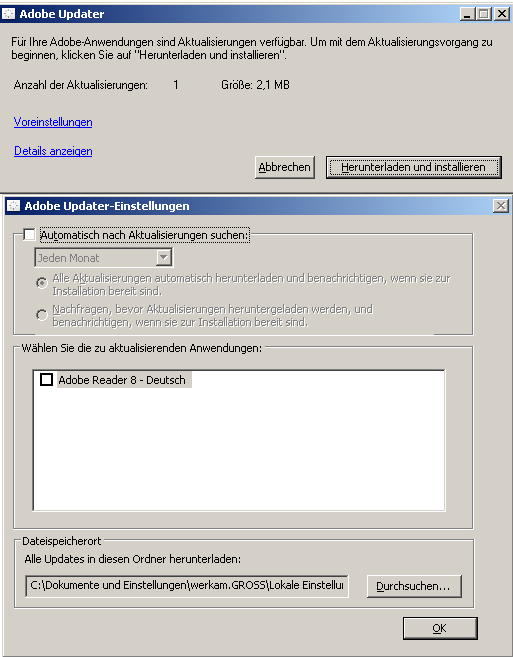 Ich wollte mal fragen, ob jemand eine (vom Hersteller vorgesehene) Methode kennt, dass der Adobe Reader Version 8.1 nicht bei jedem Starten versucht Updates herunterzuladen? Bei 7.X gabs dafür noch irgendwo einen Haken in den Optionen, bei 8.X kann ich den trotz hartnäckiger Suche nicht finden!