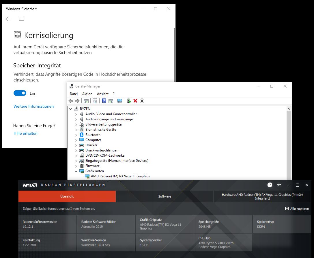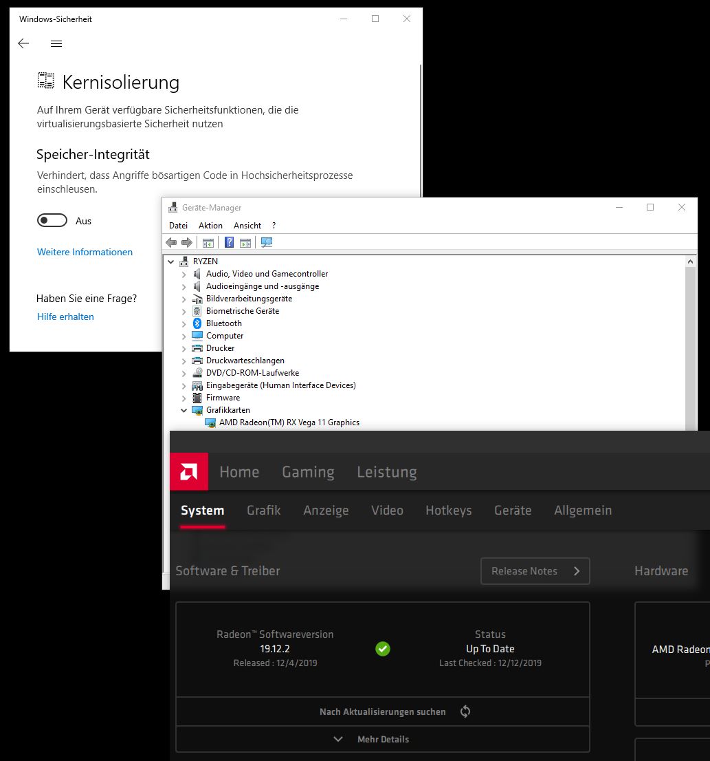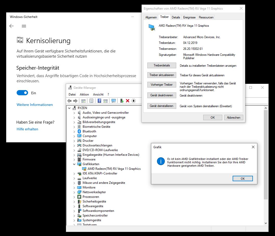 Völlig irreführend ist hier auf jeden Fall die AMD-Treiber Fehlermeldung "Es ist kein AMD Grafiktreiber installiert...". Auch die AMD-Webseite weist nirgendwo darauf hin, daß der Treiber nicht mit Kernisolierung kann, siehe: Known Issues & Installing...Note