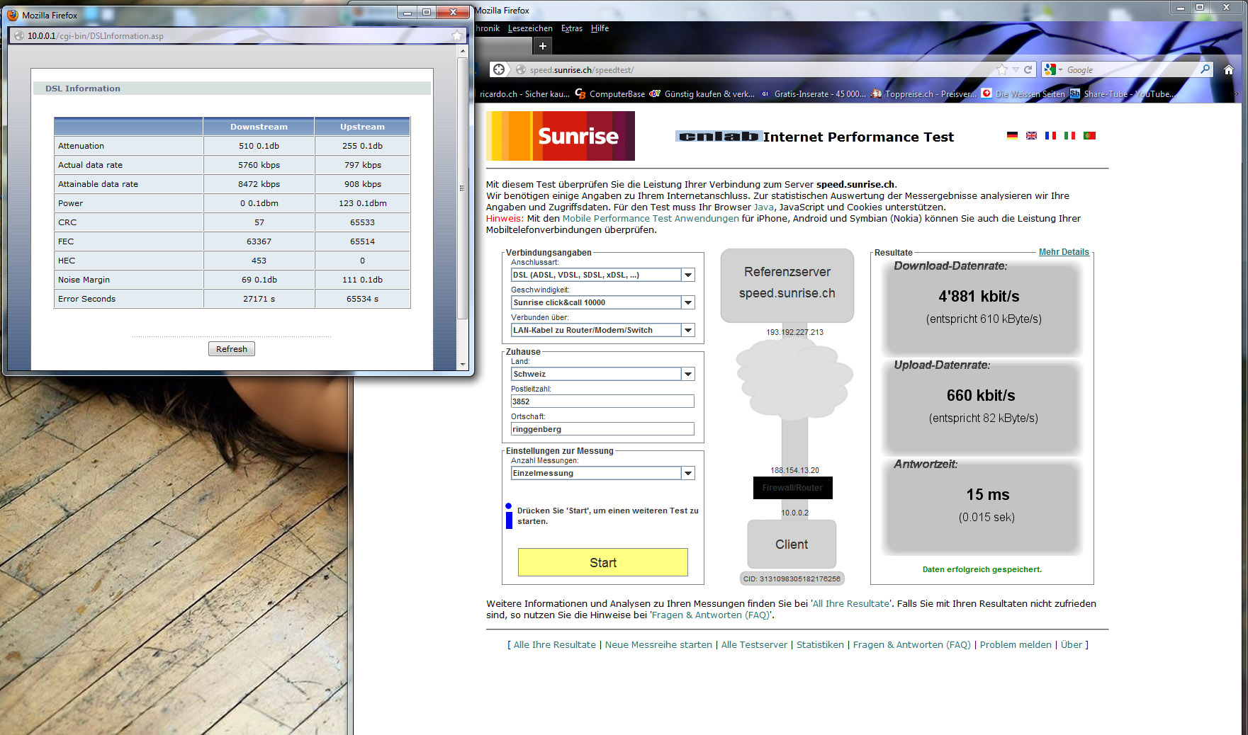 Zuerst schwankte die DSL Leitung zwischen 50-200KB/s herum. Nach dem die vom Support die Leitung etwas anders eingestellt hatten, erreiche ich nun zumindest bis zu 700KB/s.