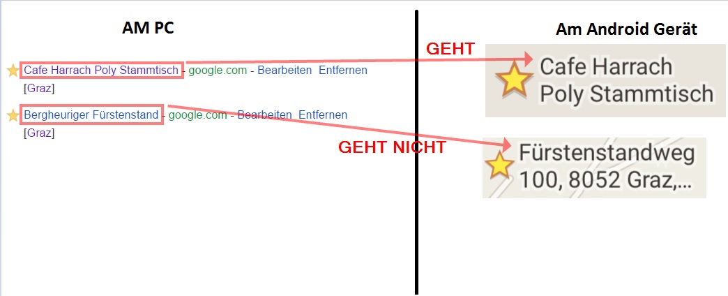 ein Lesezeichen auswähle und einen anderen Titel verpasse, dann taucht dieser dann auch auf meinem Google maps Android App auf neben dem gelben Stern. Aber leider nicht bei allen. Einige Lesezeichen funktionieren andere nicht...
