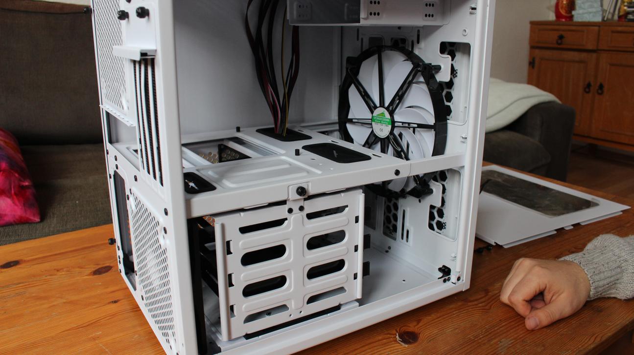 Die Seitenteile des Gehäuses lassen sich mit je zwei Schrauben leicht abnehmen. Der Innenraum ist in zwei Kammern Unterteilt, wobei die untere Kammer das Netzteil sowie einen Laufwerkskäfig beherbergt. In diesen Käfig können 3 Datenträger 3,5“ oder 2,5“ Laufwerke eingebaut werden. Die Installation der 3,5“ Laufwerke erfolgt dabei ohne Schrauben, 2,5“er müssen jedoch mit Schrauben befestigt werden. Die Schienen auf denen die Laufwerke befestigt werden bestehen aus Plastik, was zunächst nicht den besten Eindruck hinterlässt, dient jedoch der Entkopplung der Laufwerke. Direkt hinter dem Laufwerkkäfig befindet sich ein vormontierter 140mm Lüfter, der die warme Luft aus dem Gehäuse transportieren soll. Neben dem Laufwerkfädig befindet sich der Platz für das Netzteil, welches so eingebaut wird, dass der Lüfter nach außen zeigt.