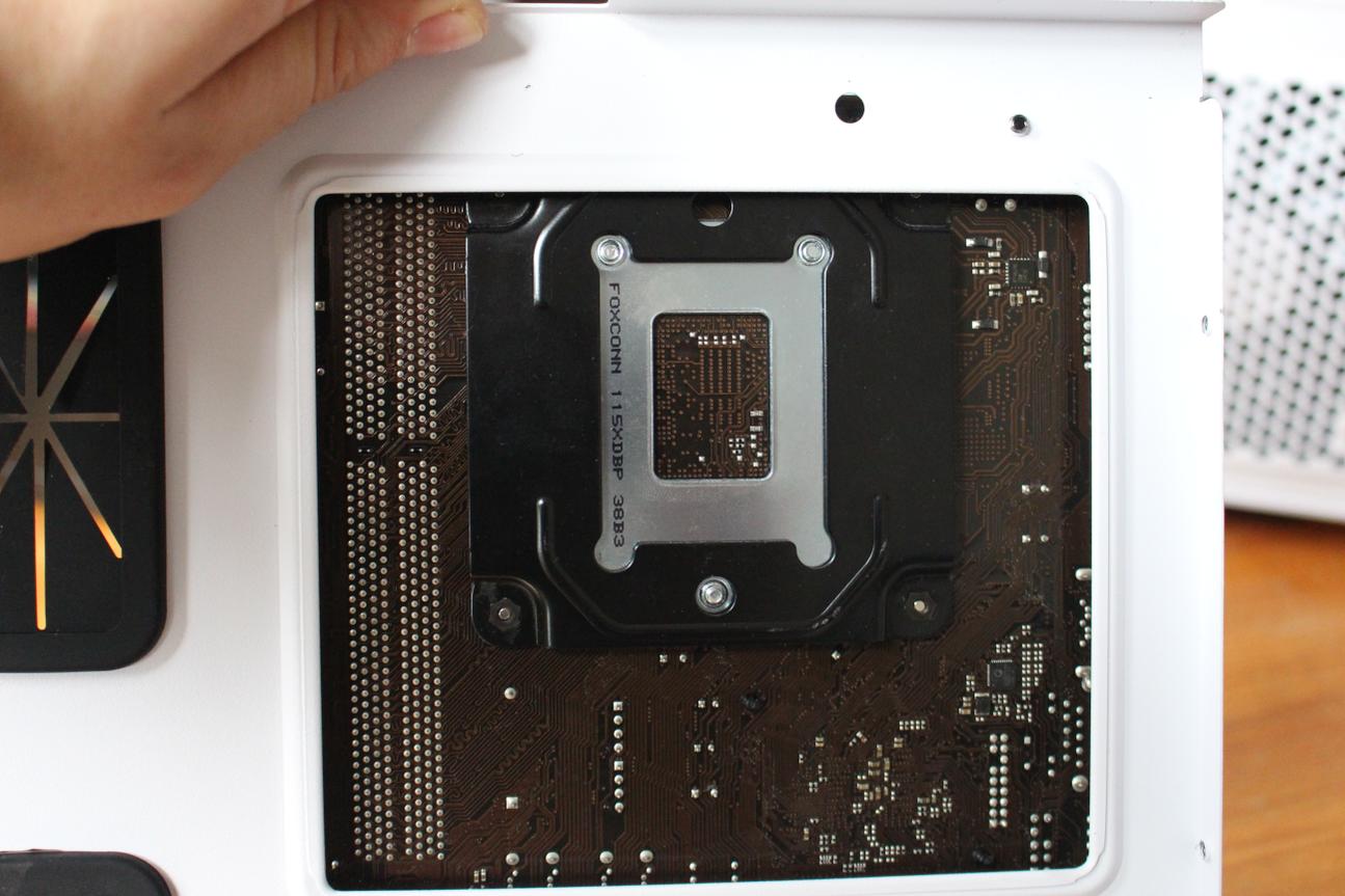 Der Einbau der Hardware gestaltet sich denkbar einfach. Das Mainboard wird auf einer Schiene montiert, die zuvor aus dem Gehäuse entnommen werden kann. Die Abstandshalter für den ITX-Standard waren bereits montiert, so dass schnell gearbeitet werden kann. Sollte der CPU-Lüfter jedoch eine Backplate benötigen, sollte diese vorher unter dem Mainboard angebracht werden, da dies sonst zu Komplikationen führen könnte. Das Mainboard zusammen mit der Schiene lässt sich dann sehr leicht zurück ins Gehäuse bringen und dort befestigen.