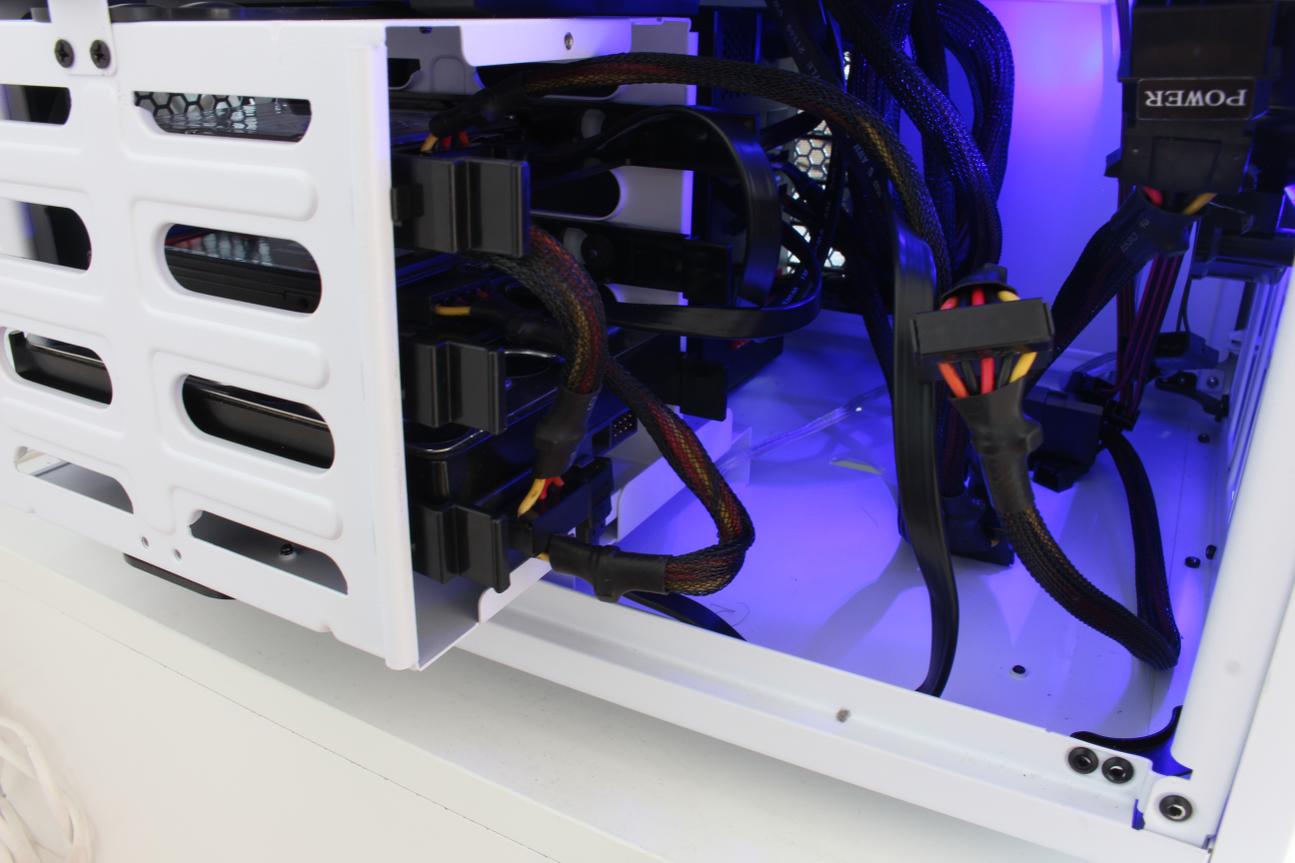 Der Einbau der Festplatten gestaltet sich sehr einfach und geht schnell von der Hand. Positiv sei die Schraubenlose Installation von 3,5“ Festplatten zu erwähnen, dies wäre jedoch auch für die 2,5“ Platten wünschenswert, da diese durch SSDs ohnehin immer häufiger anzutreffen sind. Die Verkabelung der Festplatten gestaltet sich jedoch nicht ganz so einfach, vor allem wenn mehrere Festplatten an einem „Strang“ liegen. Dadurch dass die 2,5“ Festplatten weit hinter den 3,5“ Festplatten abschließen, muss man hier etwas „futzeln“ und zumindest die Kabel meines Netzteils bereiteten hier Probleme. Dies erschwert am Ende auch den schnellen Wechsel einzelne Laufwerke. Auch ist die Positionierung des Laufwerkkäfigs nicht vollständig verständlich. So muss der Laufwerkkäfig erst entfernt werden um eine Festplatte aus diesem zu ziehen. Hier wäre es sinnvoller gewesen, ihn um 90° zu drehen um so schnell die Laufwerke wechseln zu können. Wer nur mit 3,5“ Festplatten arbeitet und die Laufwerke nicht regelmäßig tauscht sollte aber keinen Grund zur Klage haben.