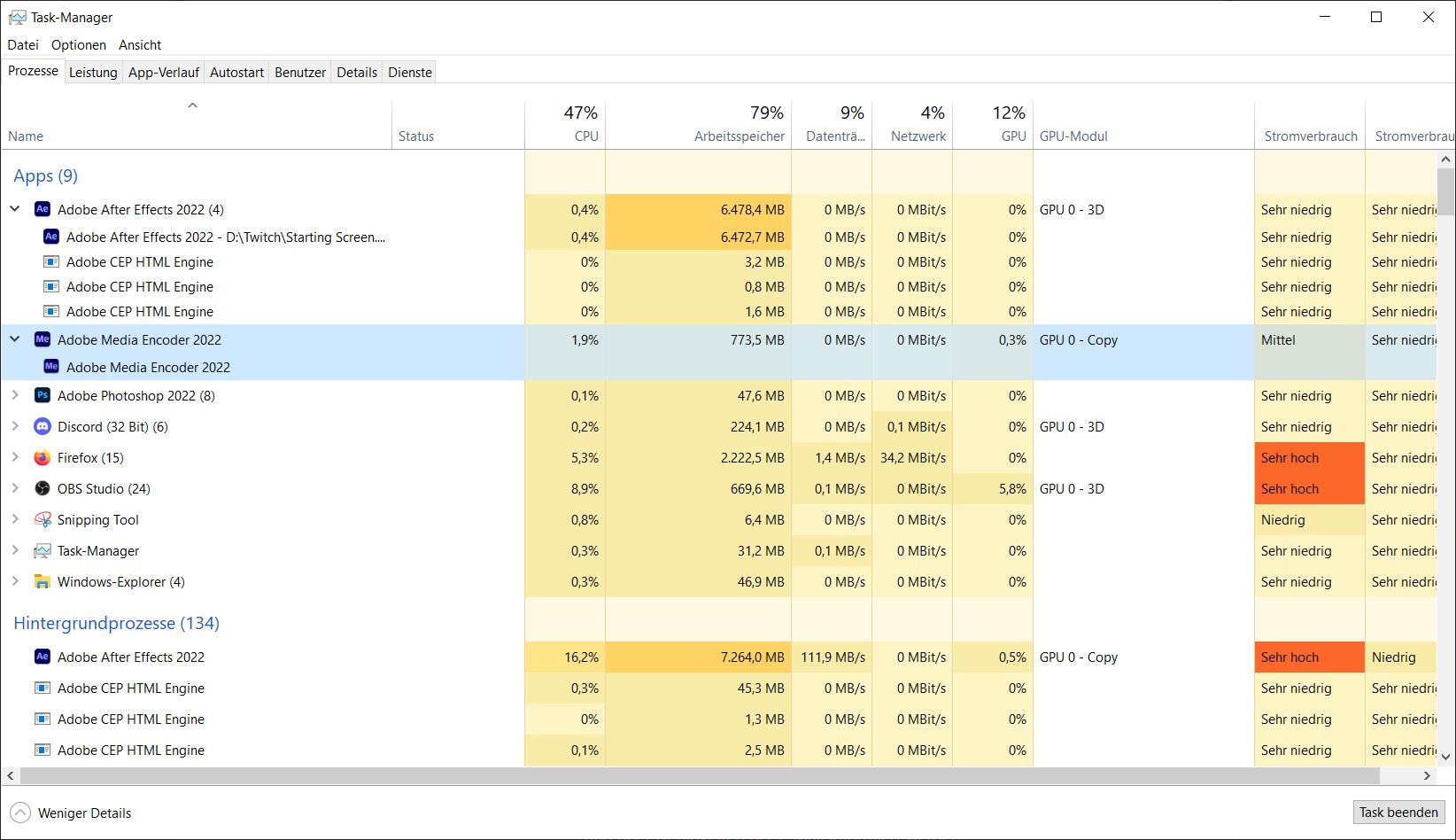 560MB und 15 Stunden Renderzeit ??? Irgendwas muss ich doch gehörig falsch machen denn an meiner Hardware kanns eigentlich nicht liegen udn irgendwie scheint after effects meine Hardware auch garnicht richtig zu nutzen laut Task Manager.