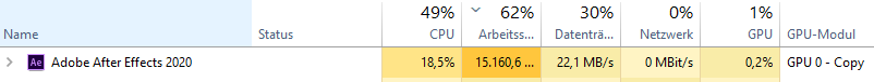 Weder CPU noch Arbeitsspeicher sind beim Abspielen in Ae voll ausgelastet (siehe Screenshot). Trotzdem ruckelt es stark.