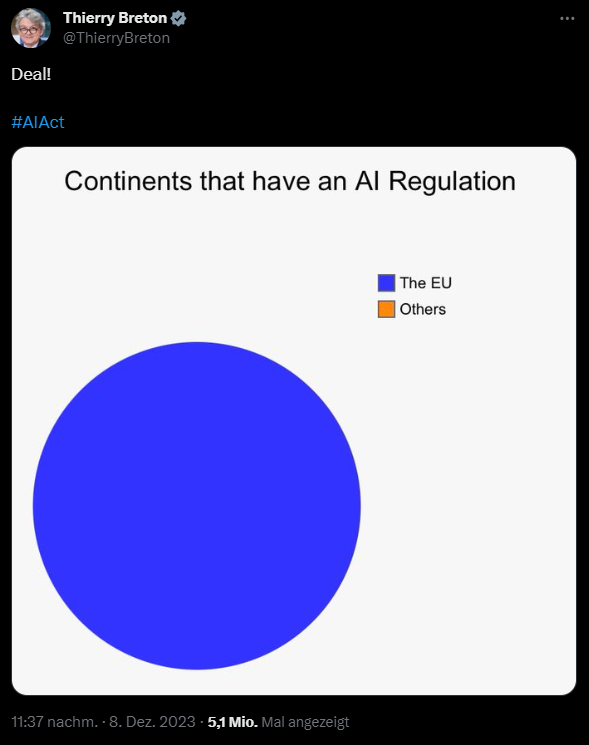 Ich befürchte sehr, dass Regulierungen die weitere Entwicklung behindern werden. Man wird das Erleben der Singularität dadurch hinauszögern. Man kann es so sehen, dass im Endeffekt die Politiker, die zu starke Regulierungen beschließen, ohne es zu realisieren gegen den Rest der Menschheit arbeiten. Von einer ASI ausgelöste wissenschaftliche Durchbrüche werden nun, wenn überhaupt, viel später als nötig stattfinden, nur weil einige Politiker Angst vor dem Unbekannten haben. Im Gegenteil müsste man AI jetzt so stark wie möglich pushen, damit endlich zumindest eine AGI geschaffen wird und bisher unlösbare Probleme der Menschheit so schnell wie möglich angegangen werden können.