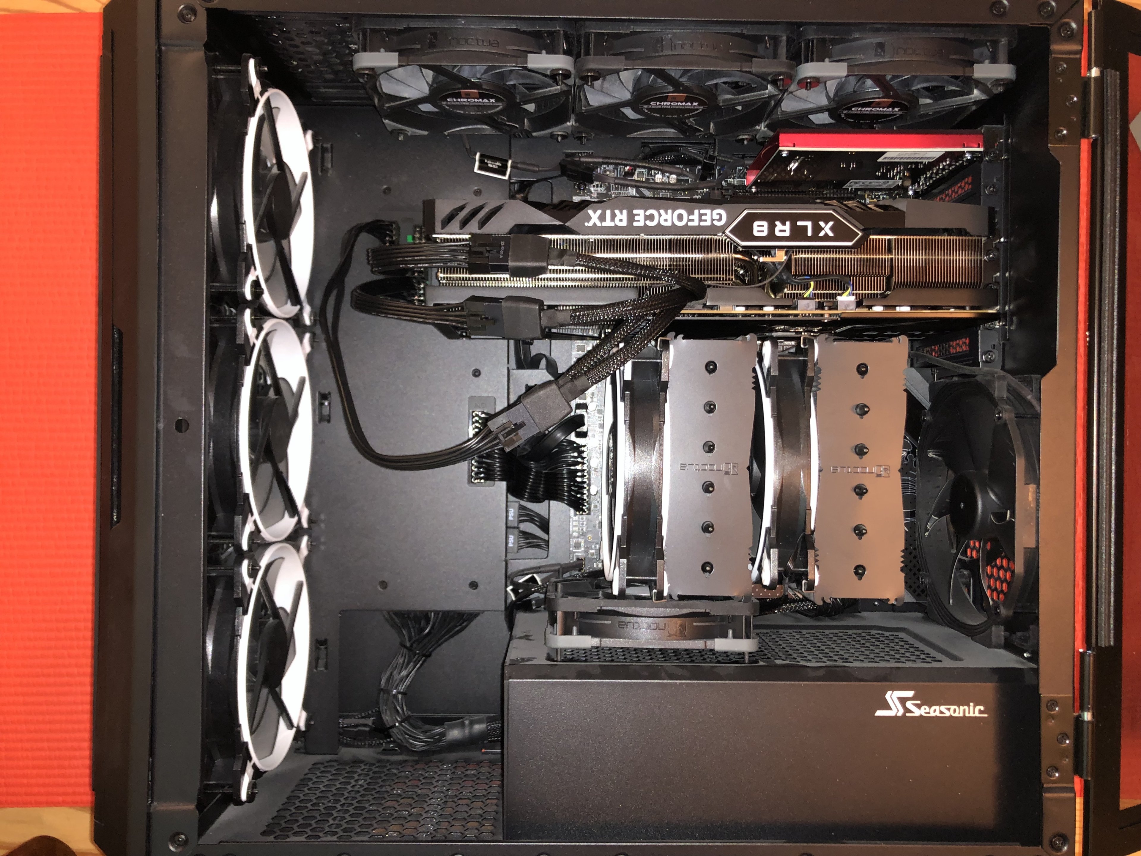 Gehäuselüfter: 3 mal ARCTIC Bionix P140 frontal, 1 mal Noctua NF-A14 PWM hinten, 3 mal Noctua NF-A12x25 PWM oben, 1 mal Noctua NF-A12x25 PWM unten