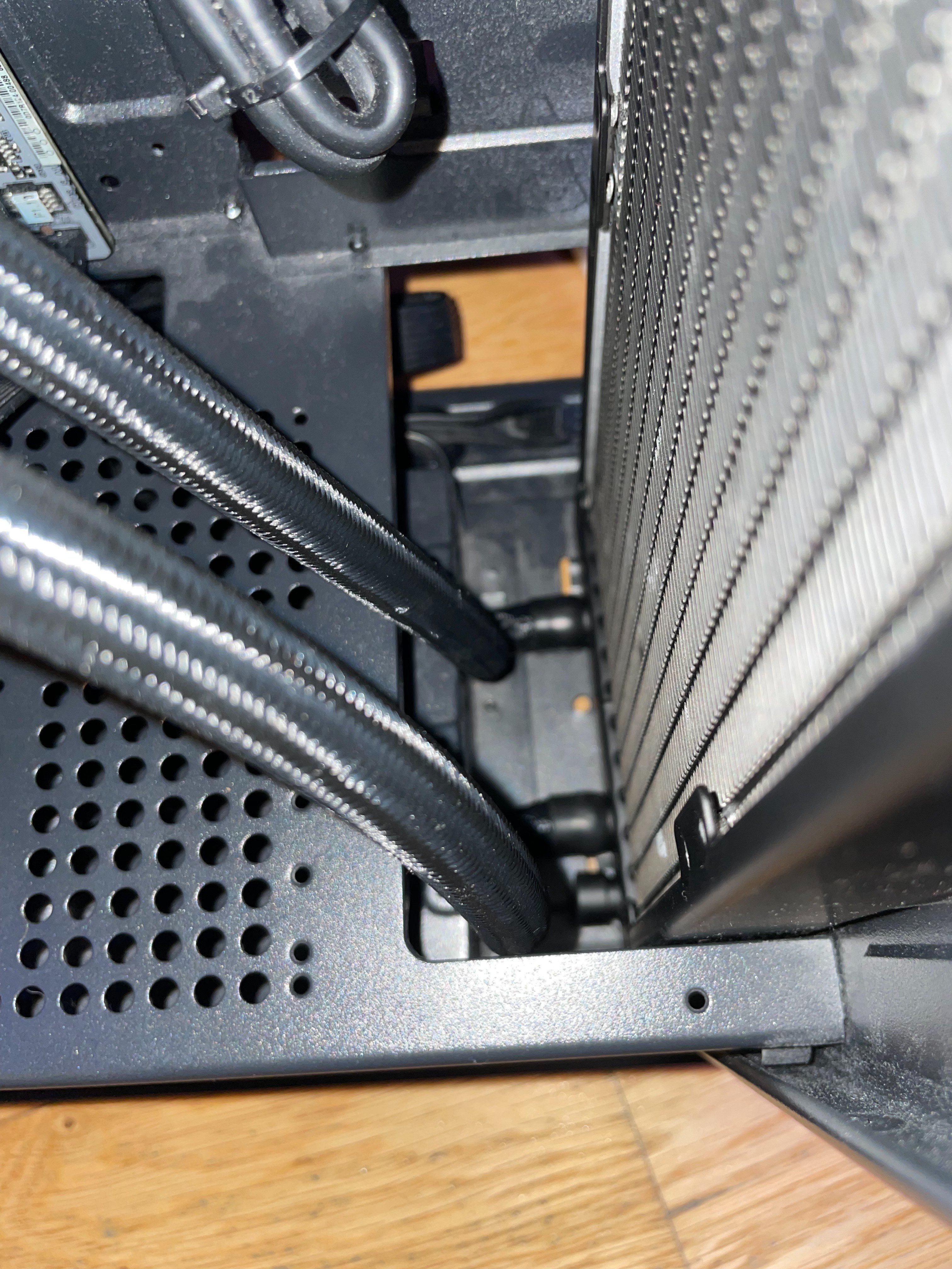 Das Problem ist jedoch, das ich unten kaum Platz habe und die Schläuche von der SSD Halterung gedrückt werden.