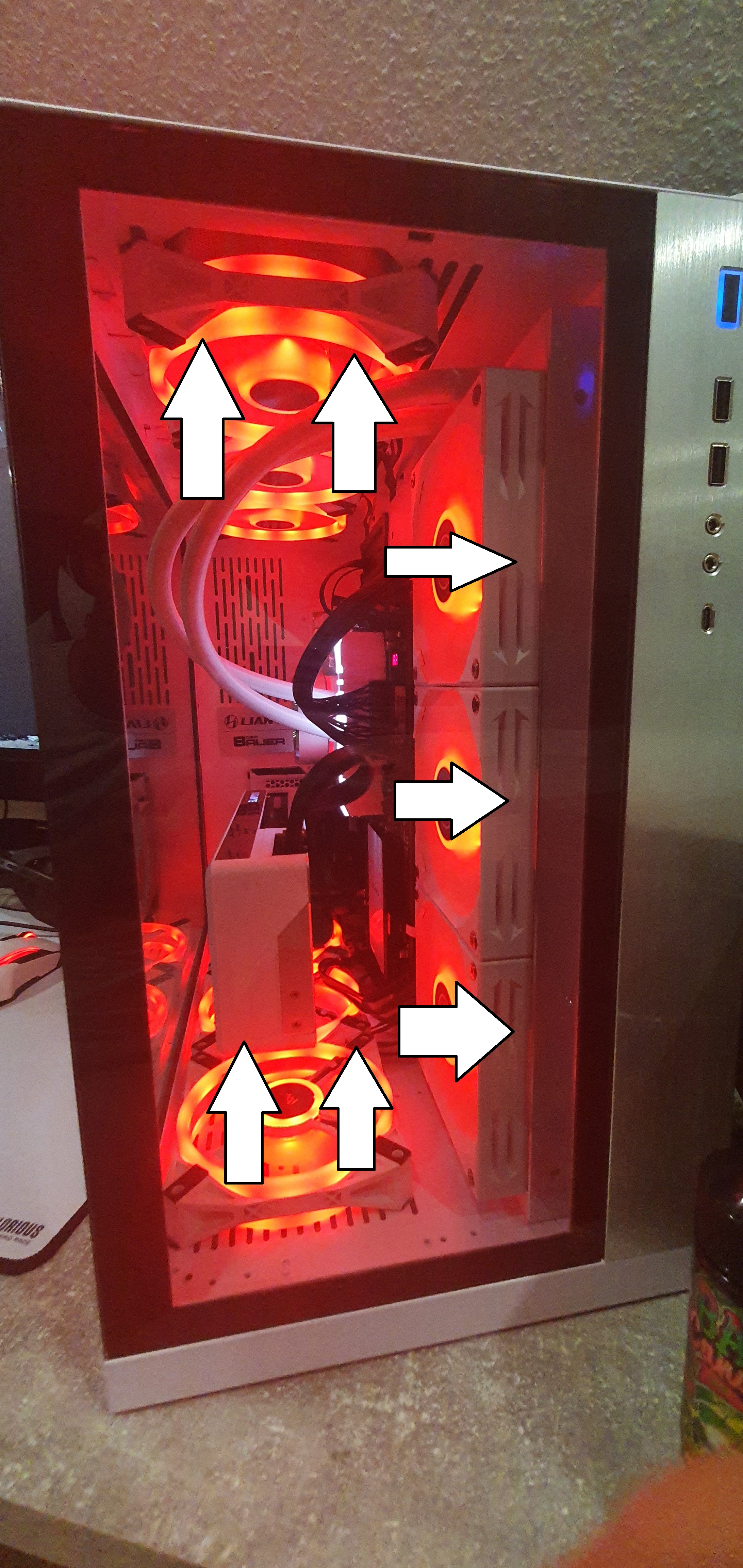 Die Aufteilung der Gehäuselüfter ist ebenfalls noch eine spannende Frage. Verbaut werden soll eine AIO Wasserkühlung (voraussichtlich die Eisbaer 360 - https://geizhals.de/alphacool-eisbaer-360-11286-a1465648.html ). Auch diese soll neue Lüfter im gleichen Design bekommen. Den 360er Radiator wollte ich oben einbauen so das die Lüfter die Abwärme entweder nach außen blasen oder nach außen saugen - was haltet ihr davon?