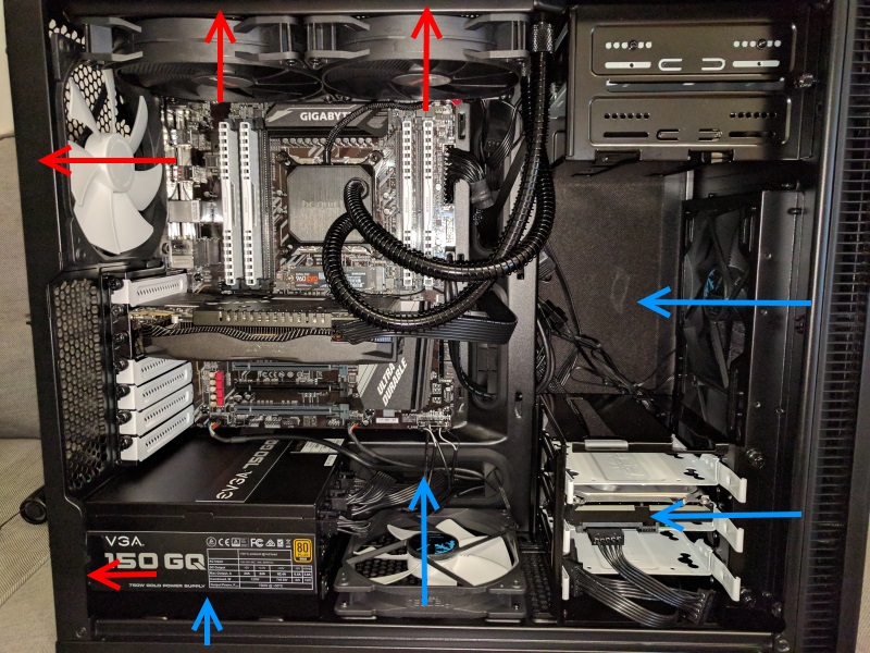 Ich würde, wie der Threadtitel schon verrät, die Lüfter gerne so platzieren, dass ich den optimalsten Air Flow habe mit wenig Staubbildung und optimaler Kühlung.