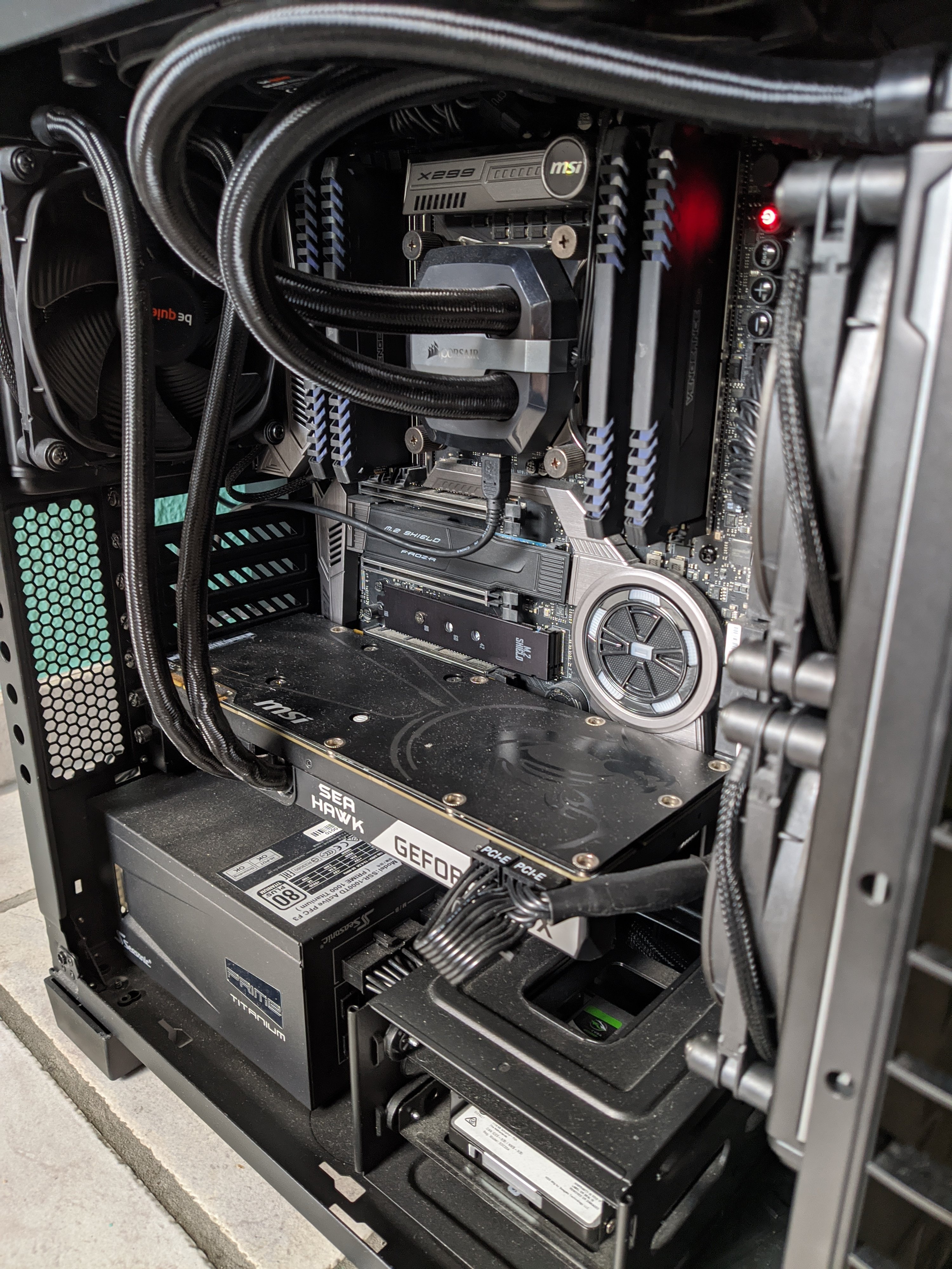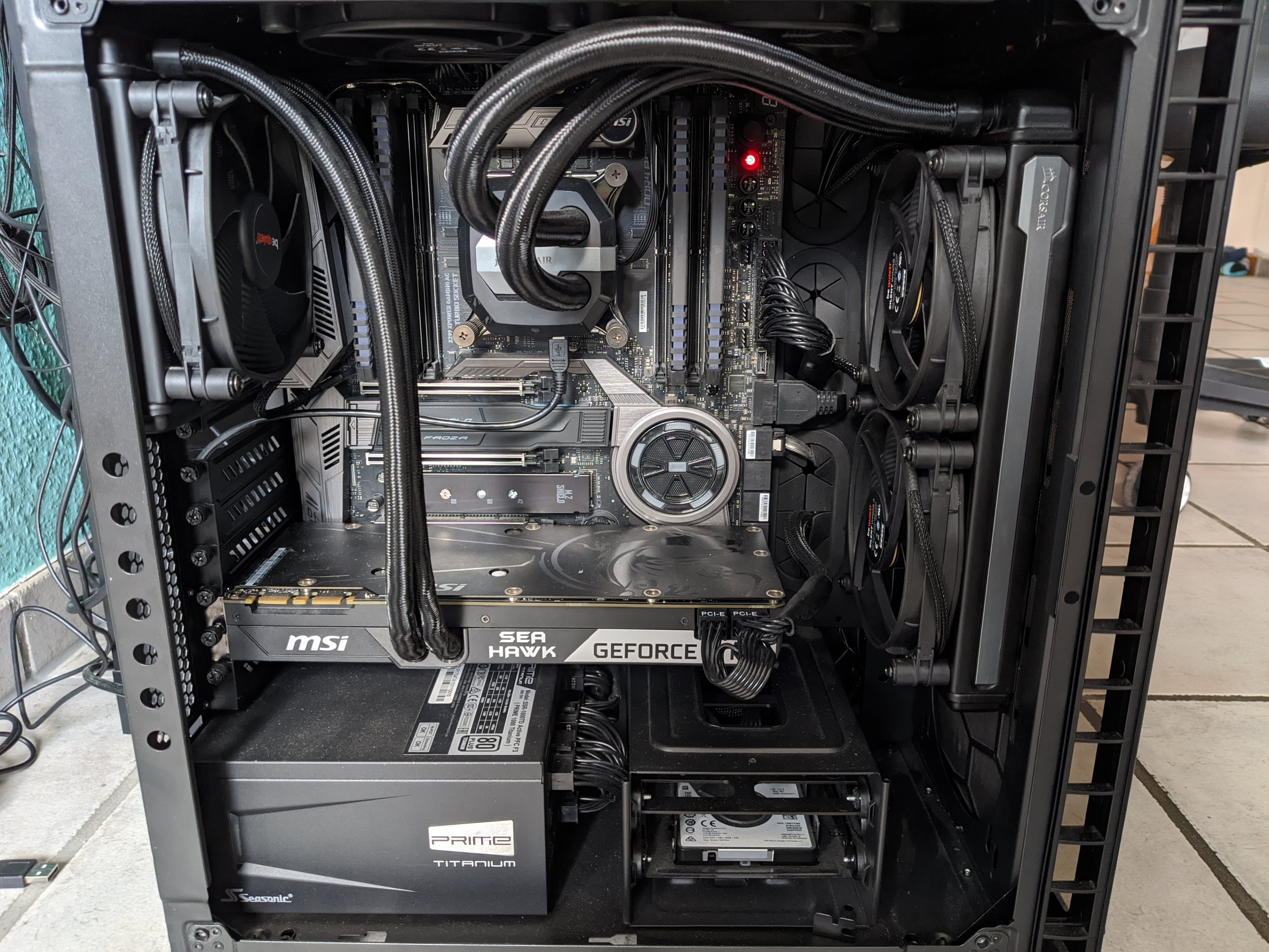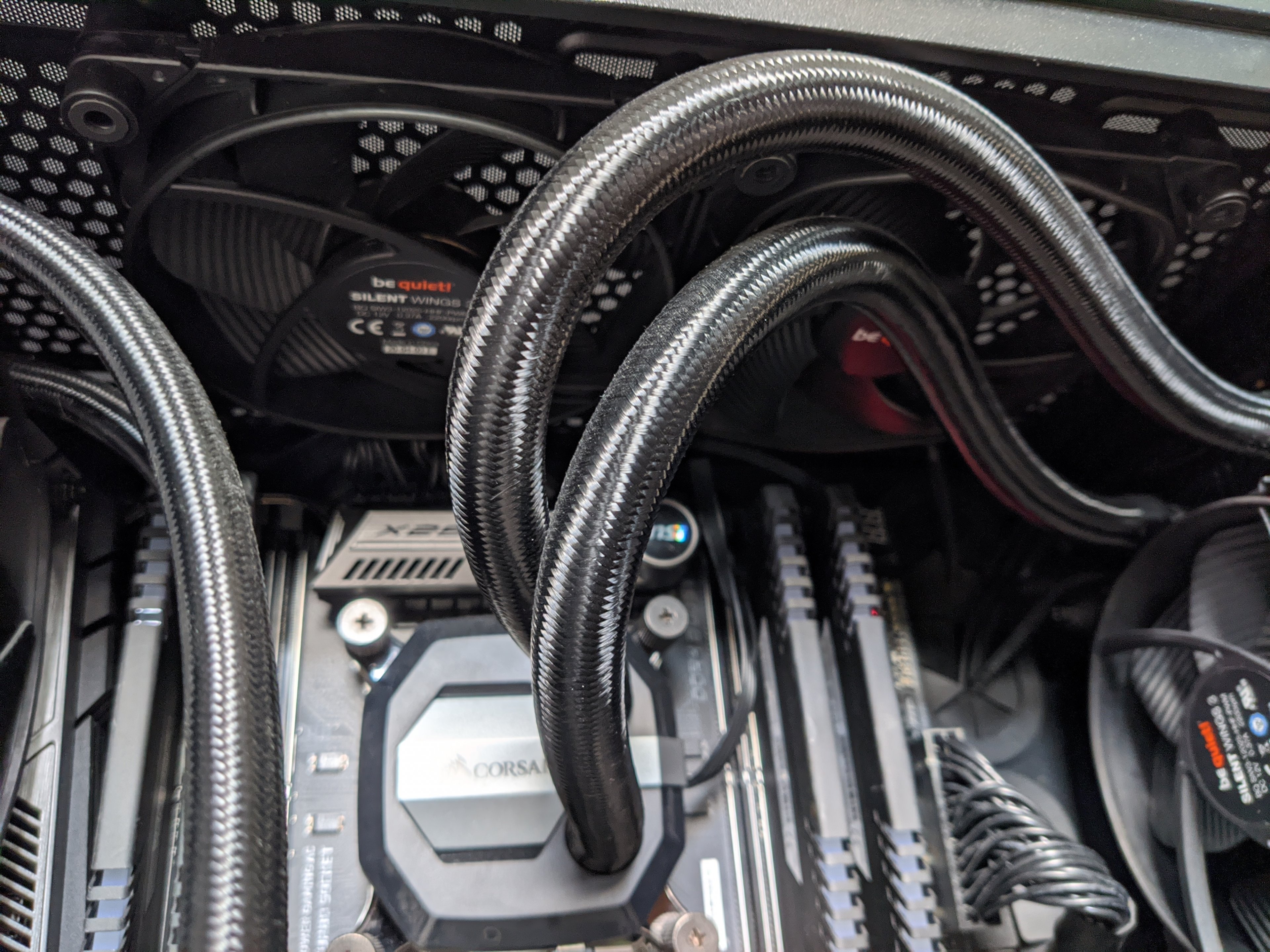 Die beiden oberen Lüfter drehen beide mit ~1000RPM. Der rechte über der vorderen AiO bläst auch die Luft aus dem Gehäuse und der Linke über der CPU zieht wieder kalte Luft rein.