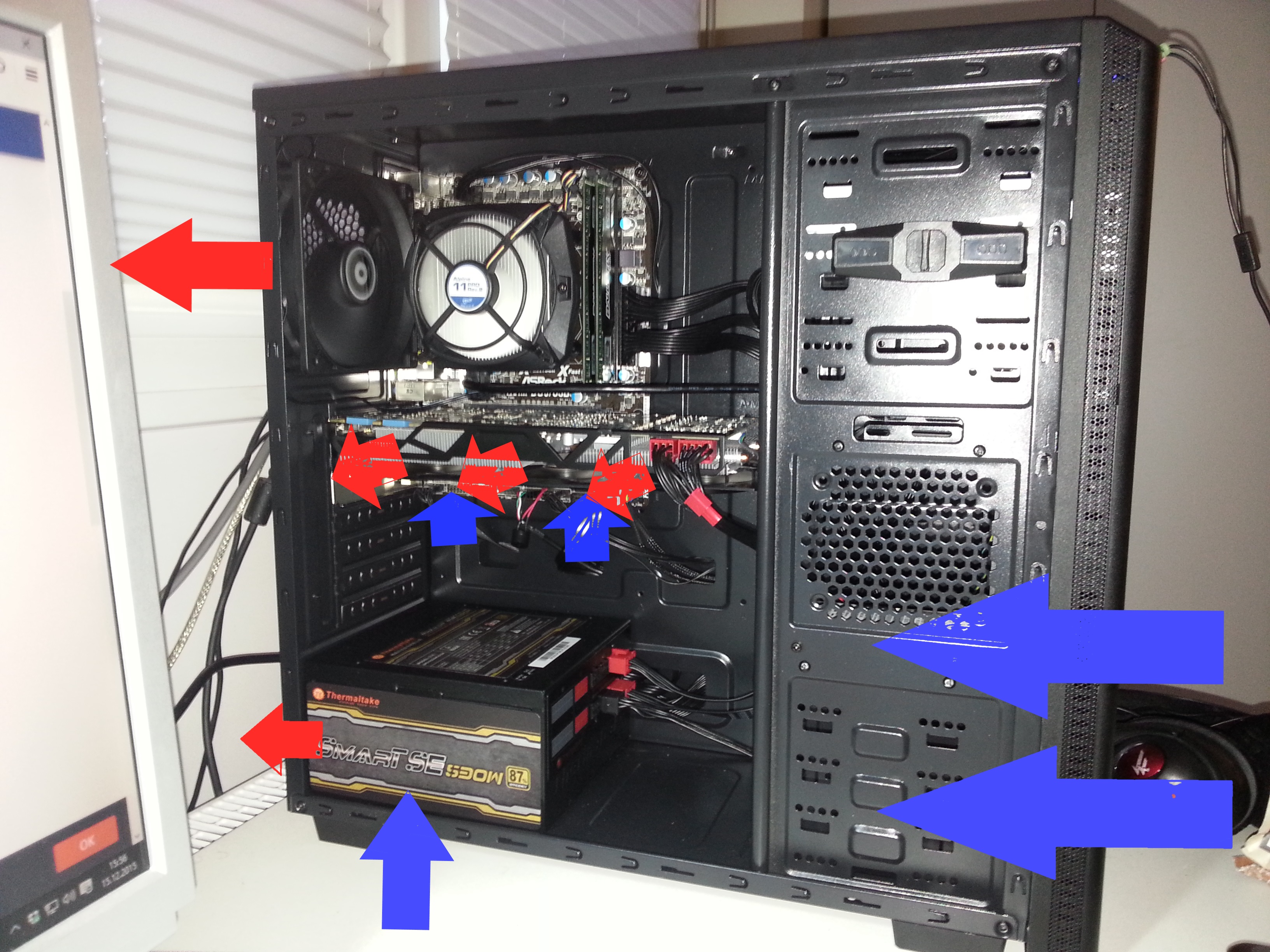 Das Problem ist nun, dass ich vermute, dass die extrem lange Grafikkarte den Airflow zum Prozessor praktisch eliminiert. Dies hat zur Folge, dass das Mainboard extrem warm wird und die Luft oberhalb der Graka sich extrem aufheizt. Dazu kommt, dass die Graka kein directexhaustsystem hat sondern die heisse Luft munter an den geschlossenen Seitendeckel bläst.