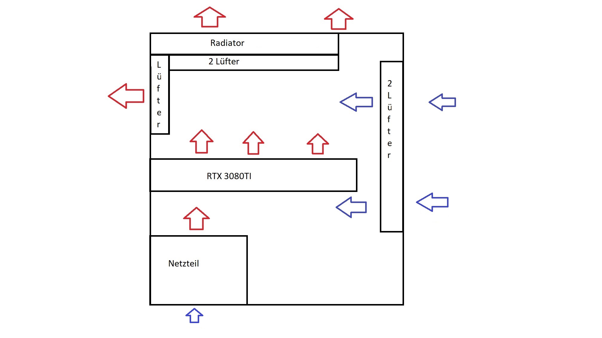 Ich habe ein grobes Schema vom Airflow angehängt. Aktuell wird die Luft zwar schön durchs Gehäuse geleitet, aber ich frage mich ob genügend Frischluft reinkommt? Die CPU Lüfter bekommen doch viel Abwärme direkt von der Graka ab. Wäre es zB eine Option den hinteren Kühler auch ins Gehäuse blasen zu lassen? Oder erzeuge ich mir damit zu viele Verwirbelungen in der Mitte?