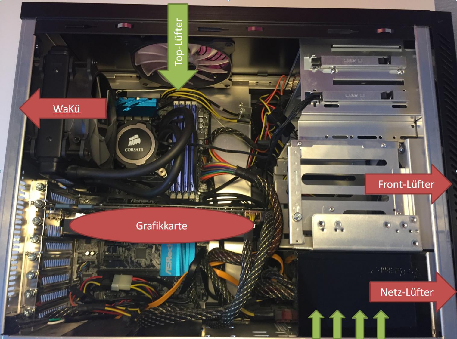 Mit dem Top-Lüfter und der WaKü ist die CPU optimal gekühlt, nur um die GraKa (ASUS GTX 770 OC) mache ich mir etwas sorgen. Unter Last liegen dort gerne mal 80°C bei 90% PWM Lüfteransteuerung an.