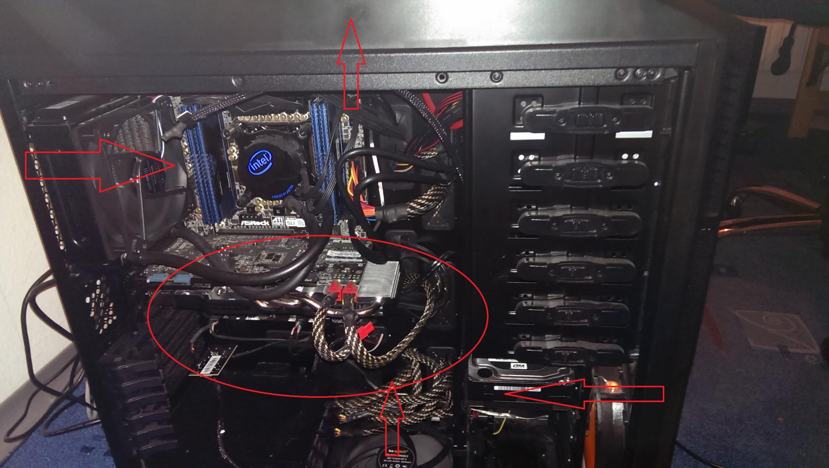Hallo zusammen ich hab letztens bemerkt das im Umfeld der Grafikkarte es extrem heiss ist (rot umkreister Bereich)was durch die 70 grad bei 100% Auslastung entstehen wird jedoch kommt es auch sonst in minimaler form vor nun wollte ich fragen ob ihr eine Idee hätteet den airflow zu optimieren.