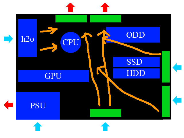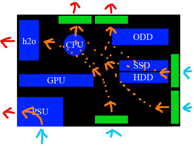 Wenn ich nun aus der Front unten, der Bodenplatte UND der WaKü ins Gehäuse einblase, bleiben nur die Deckellüfter über um auszublasen.