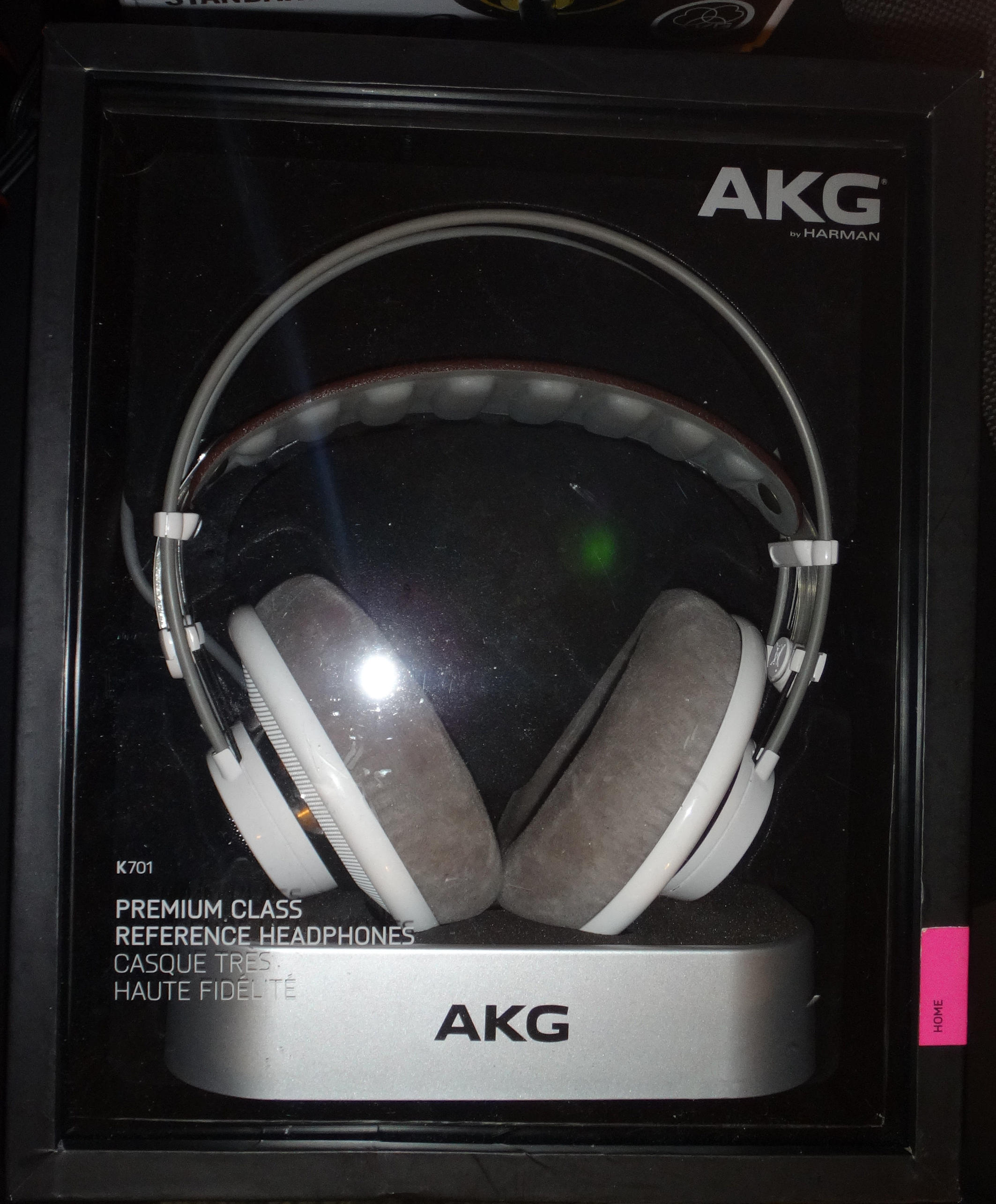 Die AKG K701 kommen in einer tollen Display Box mit Kunststofffenster und direkter Sicht auf die Kopfhörer und den Sockel.