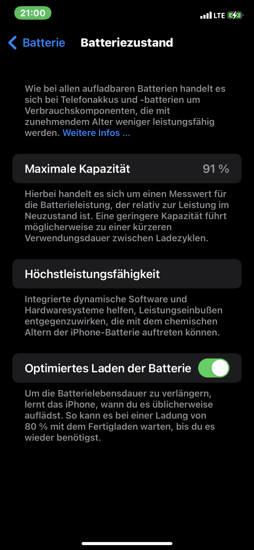 Ich hab da ein kleinen problem mit meinem Iphone 11. Das Gerät lag jetzt rund 2 Monate unbenutzt im Schrank nutze es aber seit Mittwoch wieder. Es kam auch gleich das Update auf IOS15.3 und seidem steht beim Akku nicht mehr das es Hochleistungsfähig sondern siehe "Bild" und die Akkuanzeige bleibt bei 80 % und geht nicht mehr weiter bis auf 100 %. Jemand eine Idee.