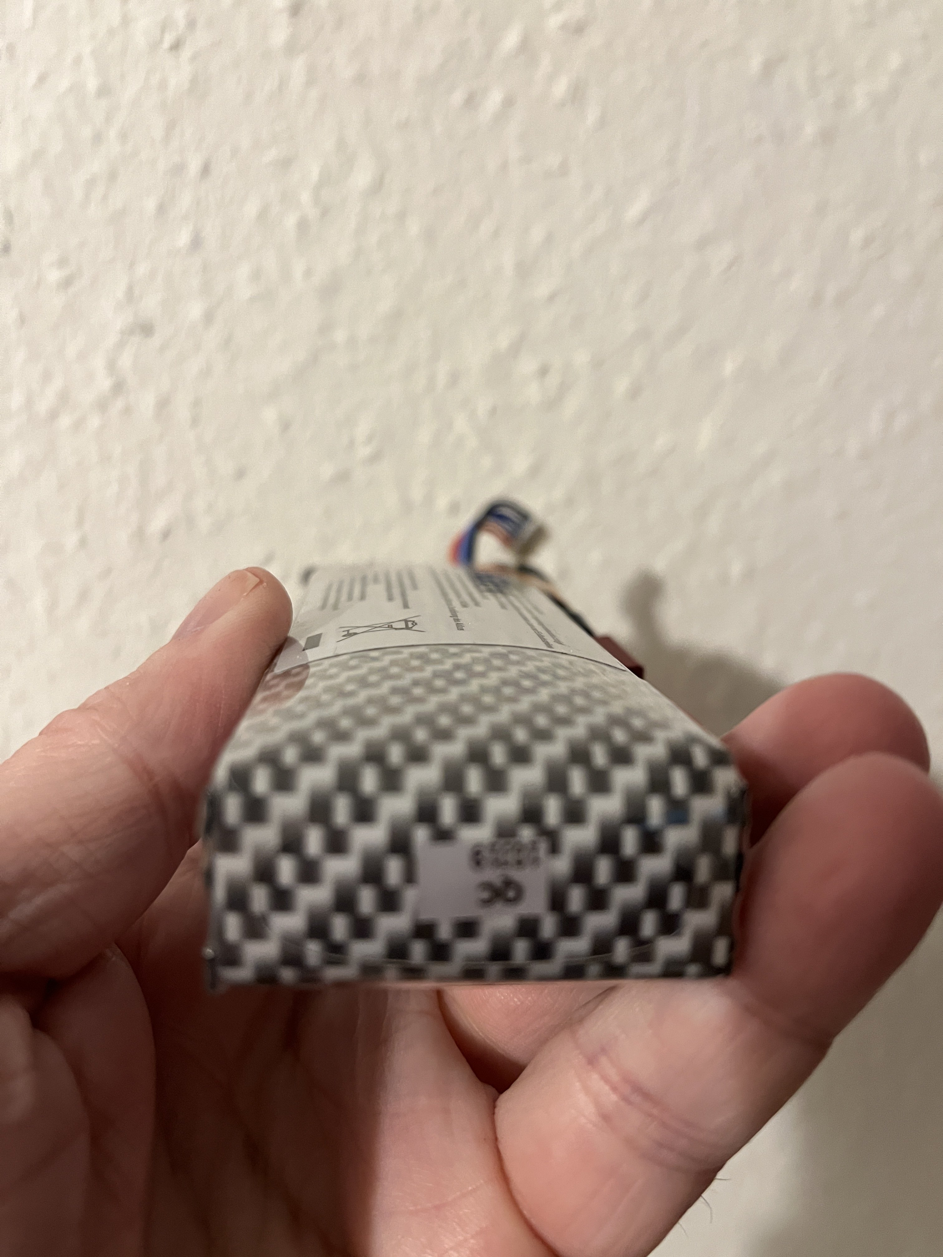 Ich hoffe man sieht die Blähung. Dieser Akku ist Schachtel neu, wurde noch nie benutzt, hat einen SoC von ungefähr 50%. Ich habe ihn vor drei Jahren gekauft, aber dann nicht gebraucht. Aufgebläht hat er sich schon nach einem Jahr. Schonender als bei 50% SoC zu lagern kann man einen Akku kaum behandeln.