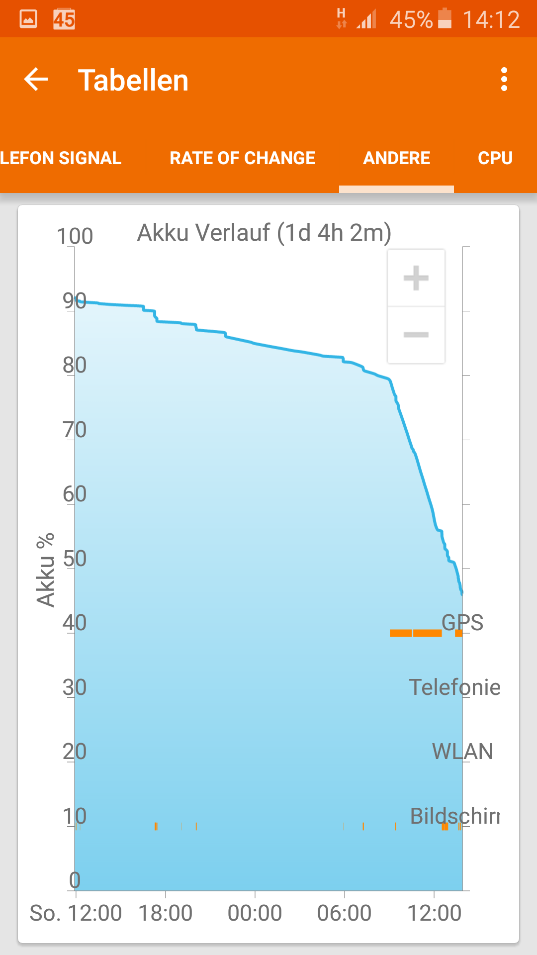 So, heute Vormittag hat der Akku dann innerhalb von 3 Stunden fast um 40% abgenommen, wobei außer einer kurzen Whatsapp-Nachricht nichts gemacht wurde und das Handy in der Tasche steckte. WLAN war immer ausgeschaltet. Was auffällt ist, dass das Handy in dieser Zeit wohl immer Aktiv gehalten worden ist, die Anzeige war heute Morgen noch bei 1:30, jetzt bei 4:30 (siehe Screenshot). Außerdem ist das GPS während dieser Zeit aktiv... seltsam.