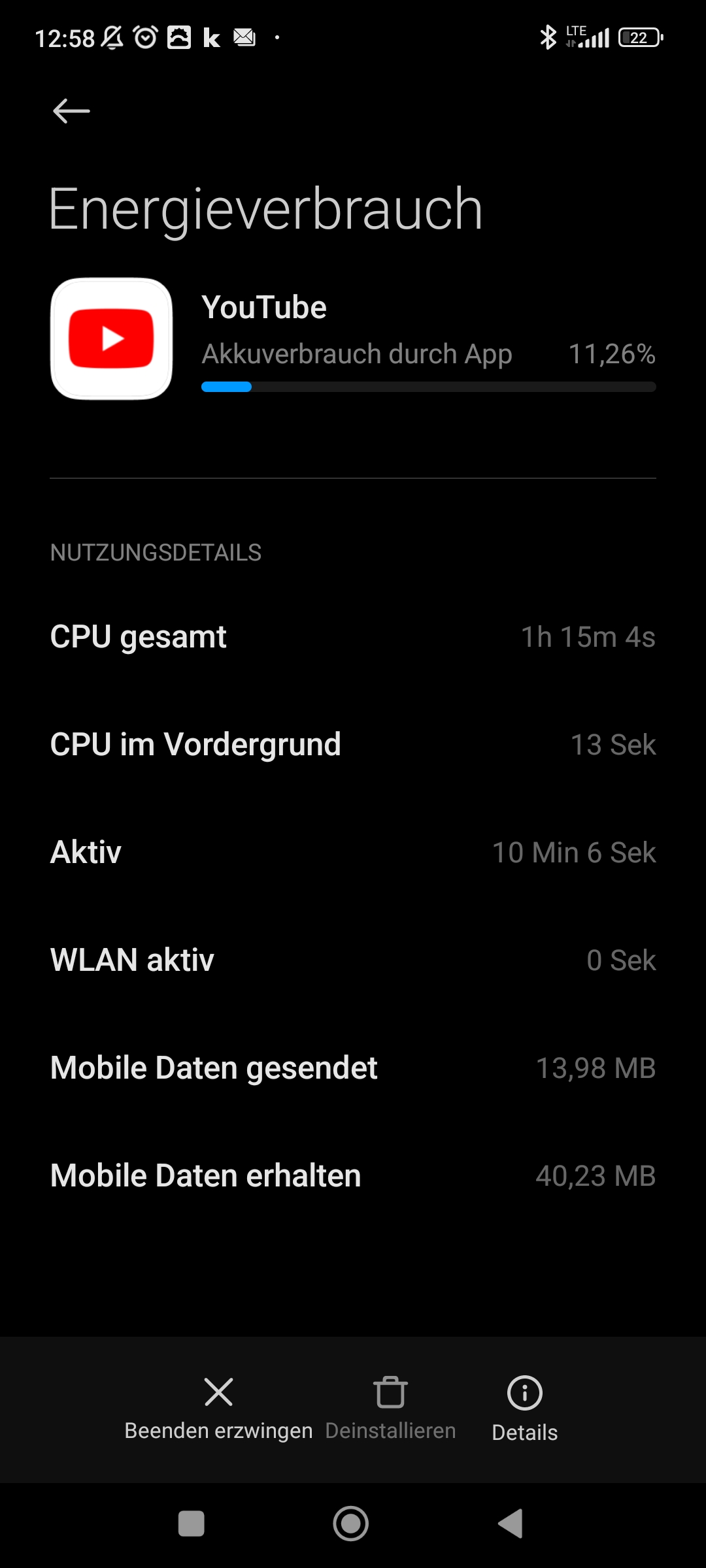 YT war 1h 15m 4s insgesamt aktiv, aber nur ca. 10 Min. im Vordergrund. Also ca. 1h im Hintergrund. Öffne mal die App-Info (dort, wo Daten und Cache der App gelöscht werden) und schränke die Hintergrundnutzung ein. Mal sehen, ob der Akku dann länger durchhält.