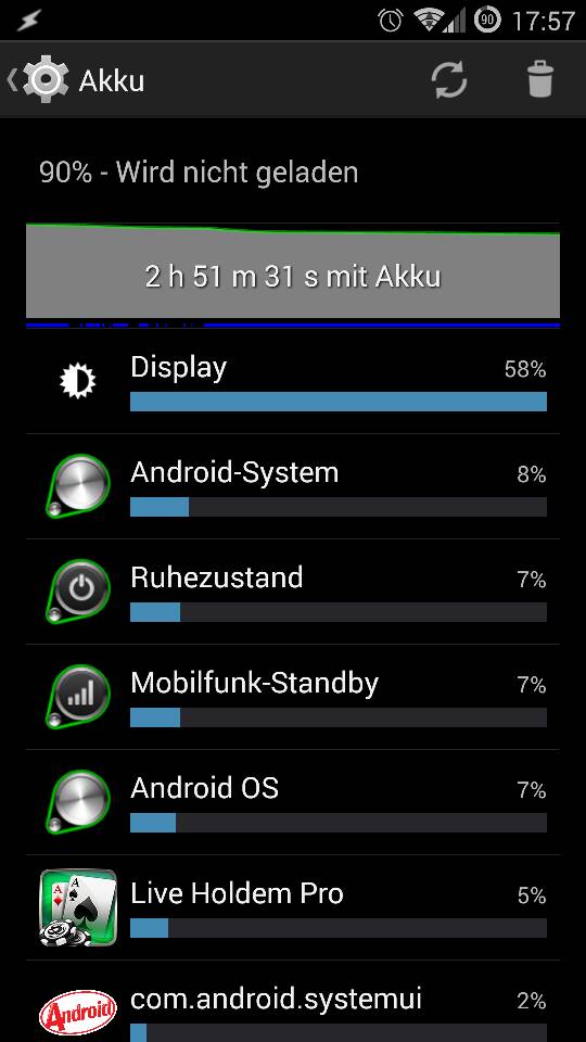 Ich hab bis jetzt knapp 3 std laufzeit und da ist der display mit 11 minuten bei 50% der höchste verbraucher, danach ruhezustand 10% und dann google play dienste 6% ...