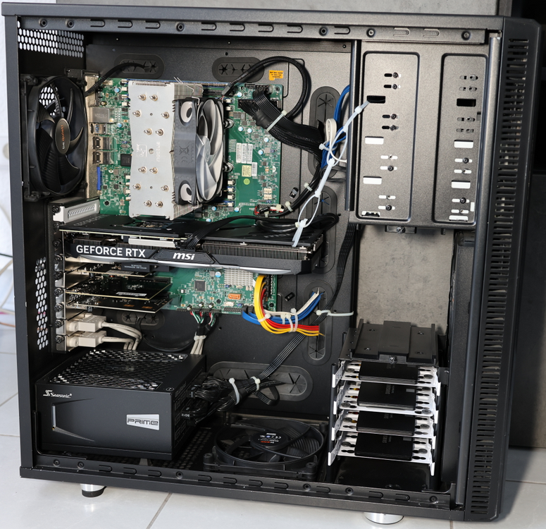 Auch eine kĂŒrzlich erworbene RTX4070 lĂ€uft trotz PCIe3.0 x16 wie geschmiert und machte wegen der geringen Sockelbreite (nur 2!) noch Raum fĂŒr eine weitere AufrĂŒstung auf 10 Gbit (Intel X710-DA2).