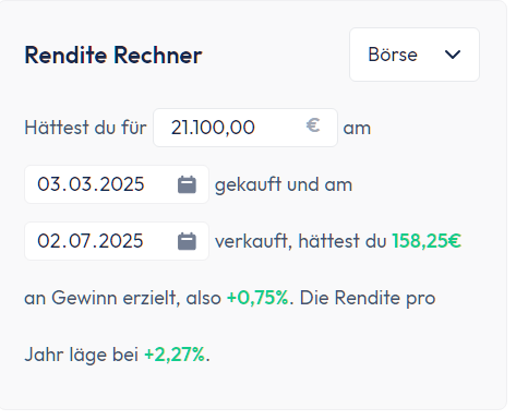 Laut Rendite Rechner bei Finanzfluss sollten das irgendwie um die 0,75% im Zeitraum von März bis Anfang Juli sein. Als Beispiel sieht das so aus: