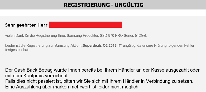 2. "Sind alle Voraussetzungen für die Gewährung der Mehrwertsteuer-Rückerstattung erfüllt, erfolgt die Gutschrift der Mehrwertsteuer-Rückerstattung durch die marken mehrwert AG innerhalb von 45 Werktagen nach Registrierung des Aktionsgerätes. " Erfolg kann hier also eventuell erst vermeldet werden wenn der Aktionszeitraum abgelaufen ist.