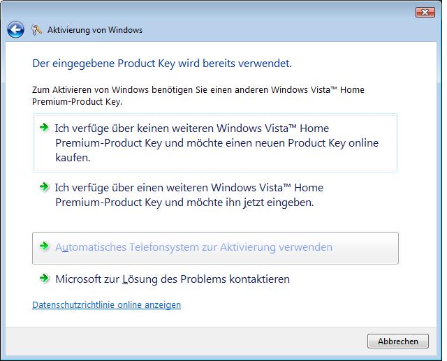 nachdem ich meine neue HD gekauft habe, installierte ich direkt mein Windows XP und dann mein Vista Upgrade... bei dieser Installation lief wohl etwas schief und ich war gezwungen, es nochmal neu zu machen... nun bekomme ich seit einigen tagen die Meldung, mein BS könne nicht aktiviert werden da der Key bereits verwendet wird... nun kann ich wählen ob ich einen einen neuen Key kaufen möchte usw...