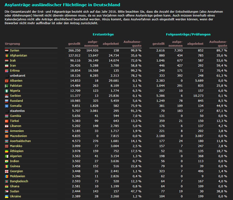 Laut der gerade geposteten Liste sind die ersten drei Treffer schon irgendwie Länder in denen in letzter Zeit Krieg herrschte, oder?hotzenplot schrieb:sind denn alle direkt aus dem Kriegsgebiet gekommen? wohl kaum, wenn dann kann man sie an einer Hand abzählen