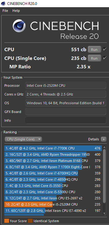 Sorry hab noch mal eben den Core M-5Y10c mit Singlecore laufen lassen. Es hat zwar ewig gedauert aber hab jetzt noch ein Ergebnis für dichWolfgang schrieb:Boah, ich kann nicht mehr...alles tut weh
