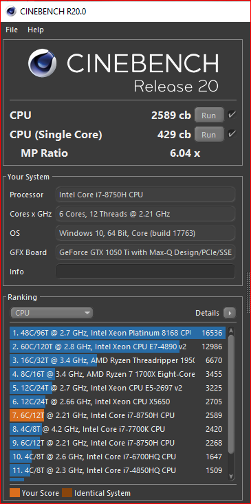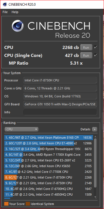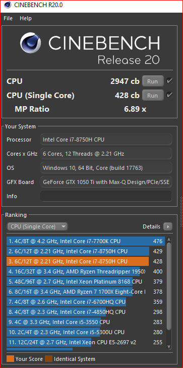 Der Laptop ist ein Dell XPS 15 mit i7 8750H , Boost von 3,9 allcore bis 4,1GHz single core.