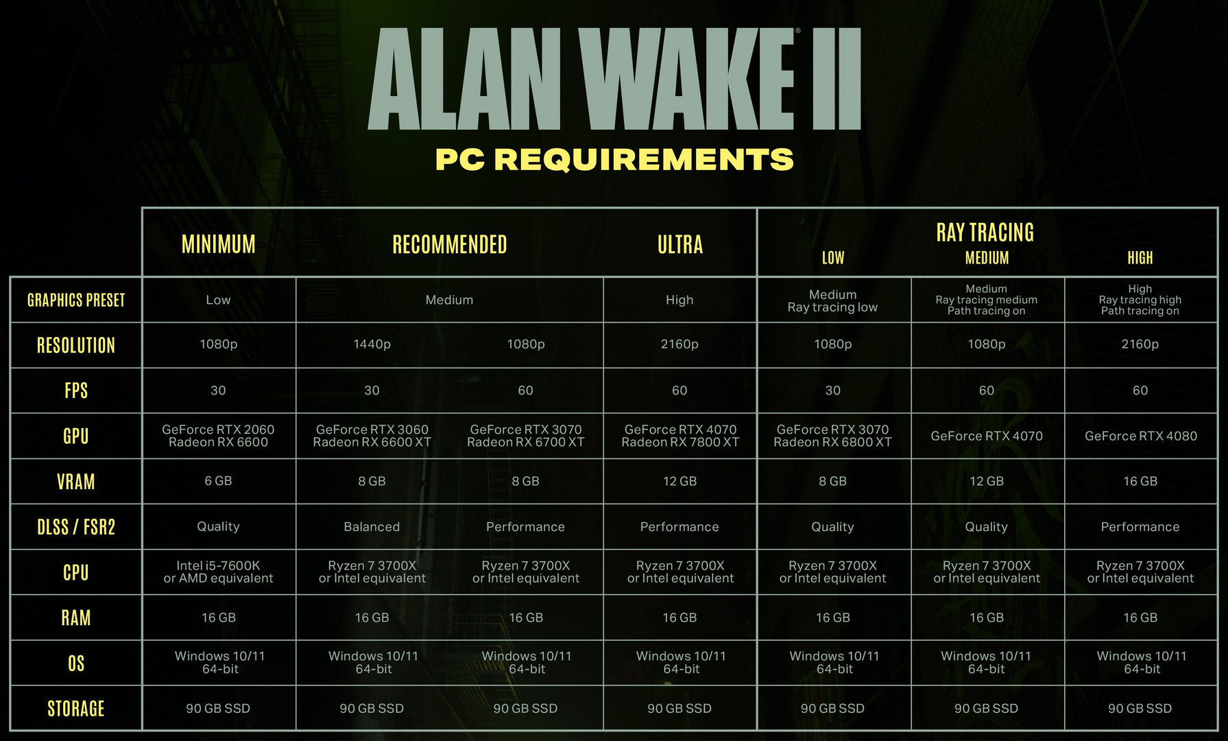 Deswegen ist das ja so eine Knaller Info das man "mit den Mainstreamgrafikkarten überhaupt" RTX 2060 oder RX 6600 (!) für 1080p um nur geringe 30 FPS zu erreichen, das LOW PRESET und DLSS/FSR2 einstellen soll! Beachte mal die Reaktion von Steve von Hardware Unboxed wenn sein Kollege die Frage eines Zuschauers nach dieser Hardware vs. Einstellungskombination stellt (in diesen Monatlichen Q&A = Frage & Antwort Videos werden Zuschauerfragen beantwortet) und dabei genau diese Anforderungen vorliest! Seine Reaktion kannst du in dem Momment nicht sehen weil sie die von mir oben verlinkte Tabelle grade einblenden, aber seine Reaktion hören! Und die spricht Bände... und hör dir dann seine Detaillierte Antwort an was man durch diese Kombination an Bildqualität erwarten kann wegen DLSS/FSR in nur FullHD Auflösung mit Low Grafik Einstellungen genutzt wird...