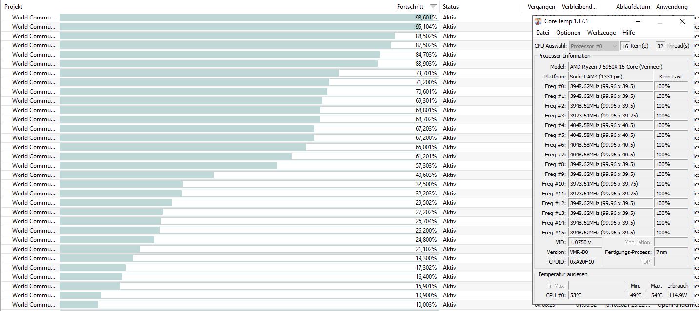 Im Cinebench 23 sieht das ein bissel anders aus für AMD und Singlecore?.. ich habe kein einziges Spiel was nur Singlecore nutzt. Hier mal eben gemessen, jeweils single und multicore mit meinem 5950 mit manuell beschränkter, gedeckelter Leistung: PPT 125 , TDC 85 , EDC 125, Offset Negativ - 10, bei singlecore dümpelt er damit bei 4.95 bis 5.1 GHZ rum. Unter Vollast bei Boinc, 32 Threads WorldCommunityGrid Openpandemic Covid19 zwischen 3.9 und 4.2 GHZ auf allen Threads. Auf default schafft die CPU zwar mehr aber verbraucht mir zu viel Strom, wegen Boinc-Dauerlast.