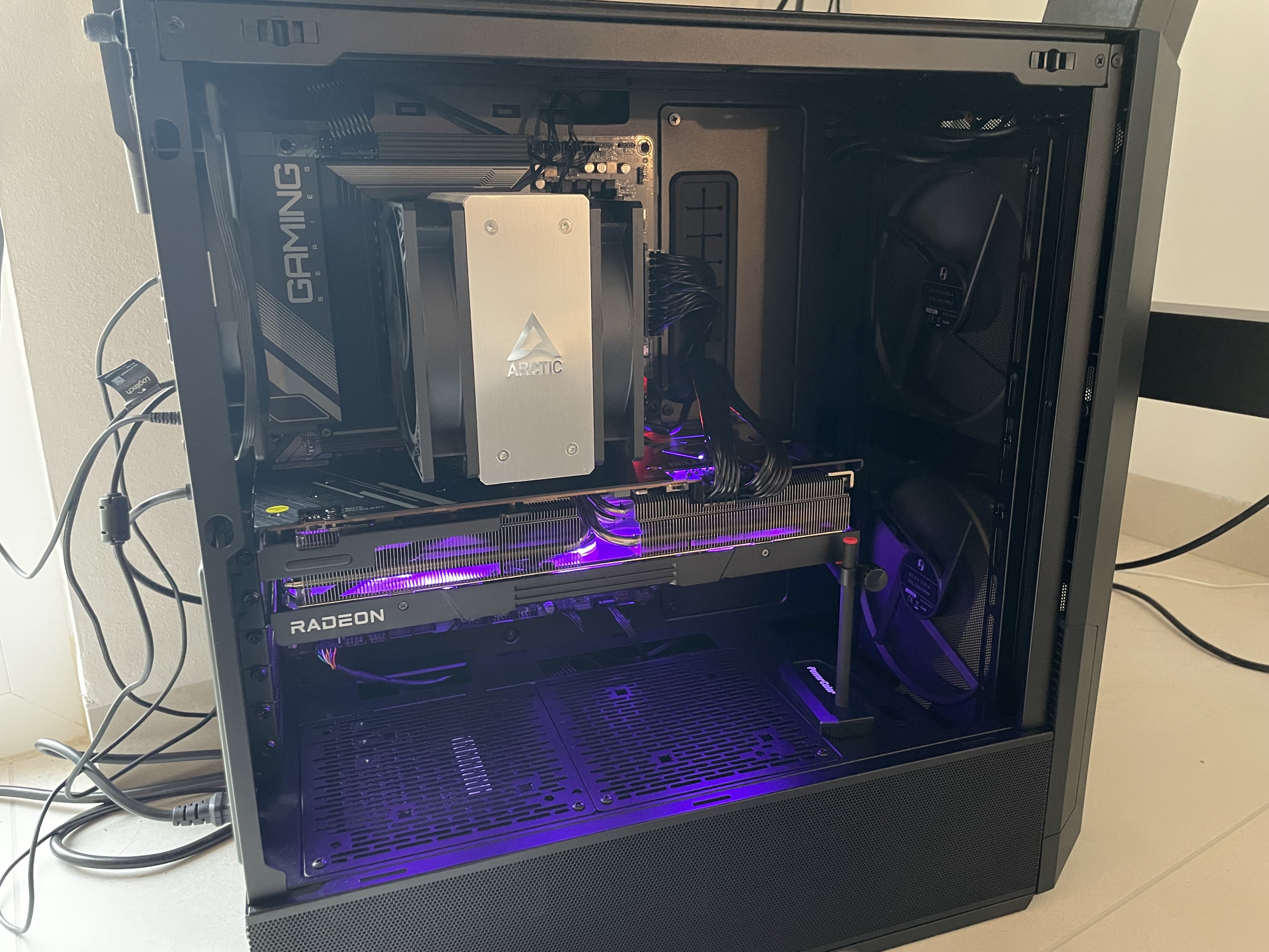 Läuft! Ich bin sehr glücklich wie dezent der PC ist, das Lila der Grafikkarte reicht mir absolut an Farben. Kabelmanagement im PC ist für einen Laien ganz okay denke ich, vielleicht hole ich mir noch einen Kabelkanal damit es unterm Schreibtisch besser aussieht, aber da schaut eh niemand hin
