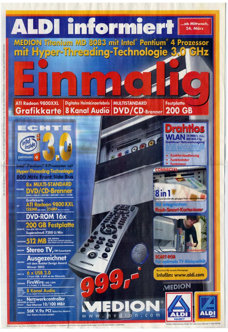 Der letzte Aldi PC im Haus hatte 3ghz Pentium 4 und ne Radeon 9800xxl. Soweit ich mich erinnere waren die Karten in den Medions etwas weniger stark getaktet als die normalen 9800er. Mit diesem PC verbinde ich die besten Spiele-Erinnerungen. Der hielt lange durch. 7-8 Jahre. Der RAM bekam nochmal ein Upgrade und die GPU wurde durch eines der letzten AGP Modelle getauscht als es nur noch PCI-E gab. Ich glaube es war eine 1950XTX. Das Problem war, dass das Gehäuse so gut wie keinen Airflow hatte. Irgendwann musste die Seitenabdeckung raus und ein Ventilator drauf xD