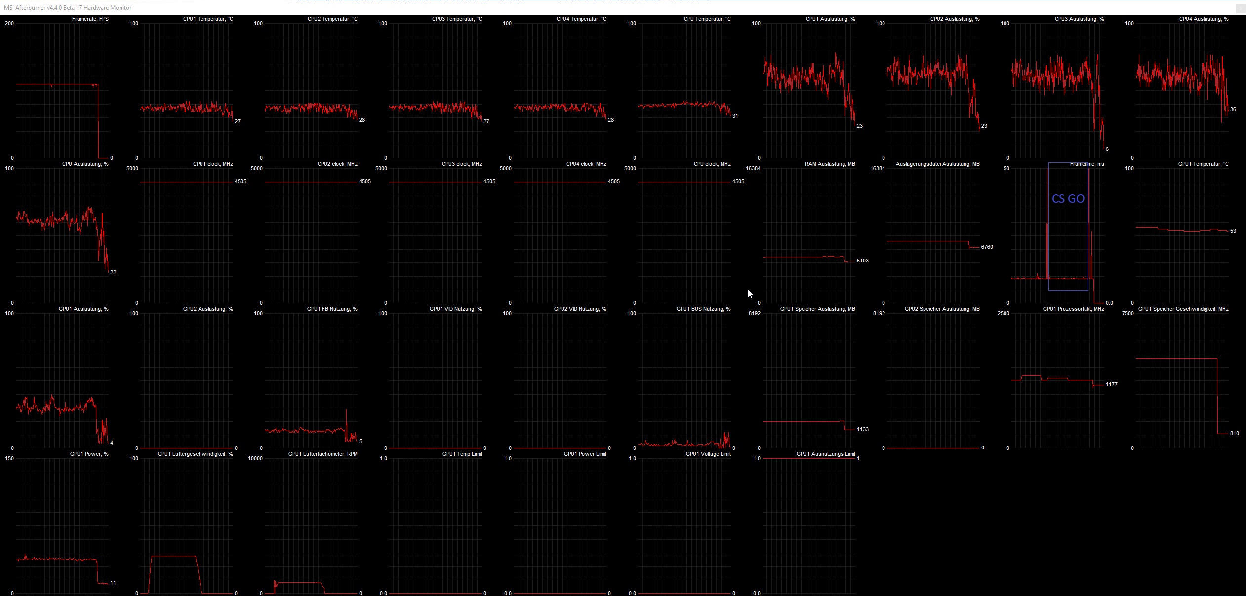 Während ich CS GO mit vielen Mikrorucklern spiele, bleibt die Frametime nahezu konstant. Die Spikes markieren Anfang und Ende des Spielens.