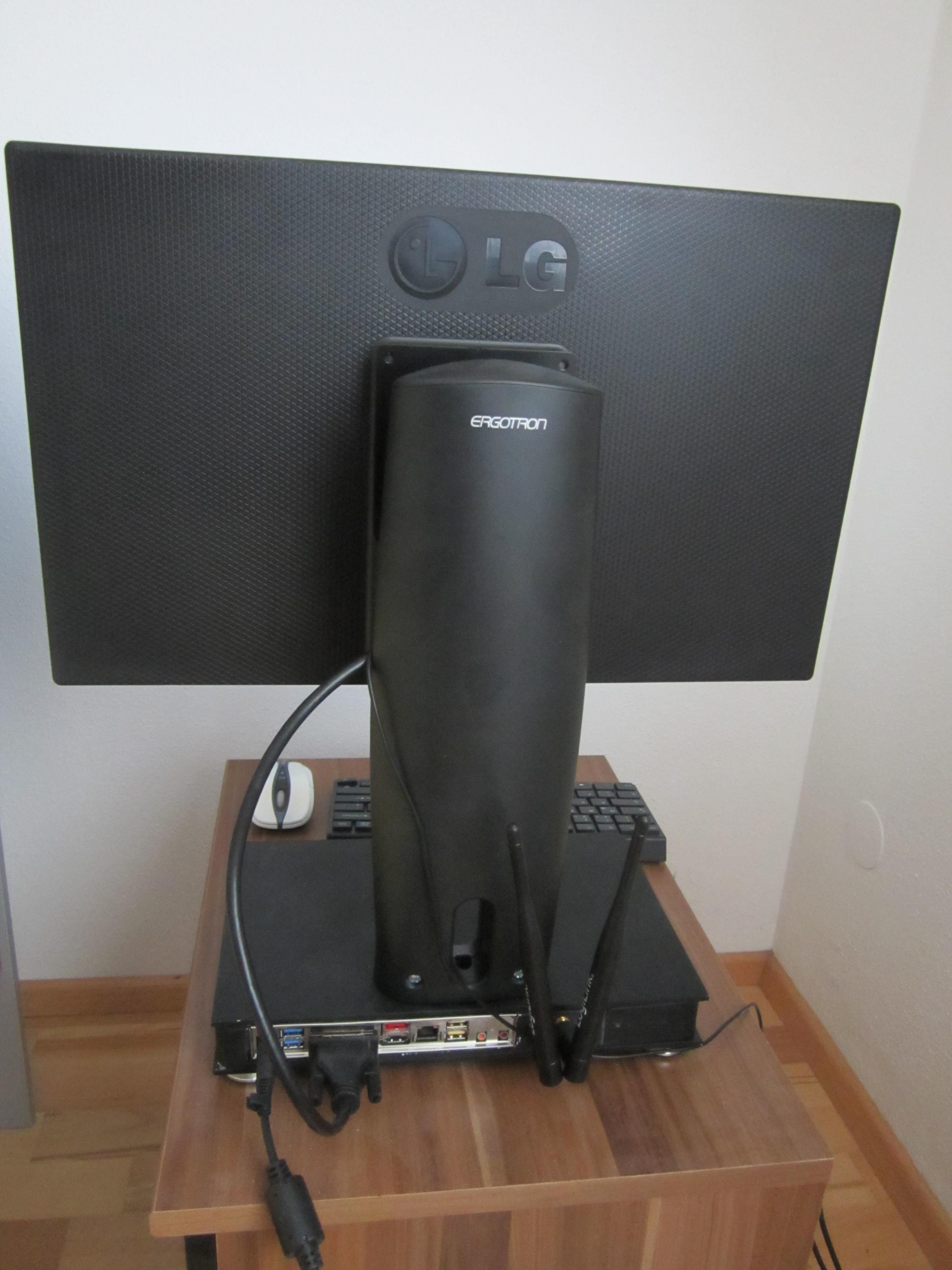 Als Monitorhalter kommt ein fertiger Ergotron Halter zum Einsatz, man muss das Rad ja nicht neu erfinden!