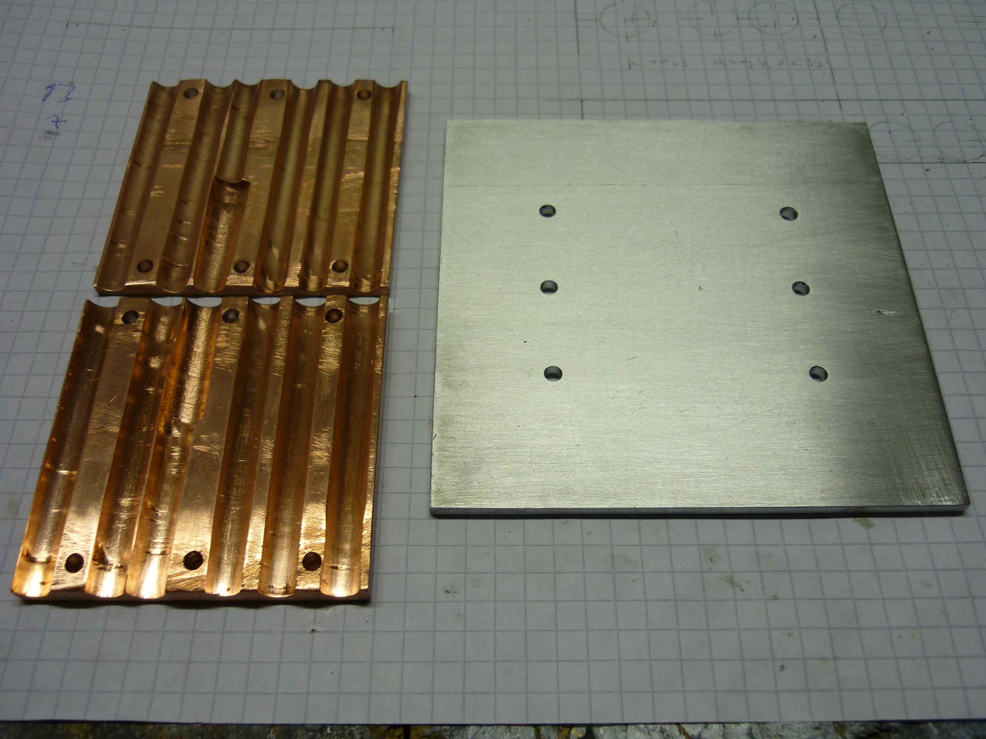 Der Prozessorkühler sollte zuerst aus diesem(Scythe Katana 3) Kühler gebaut werden. Ich wollte versuchen die Lamellem abzuziehen dann die Heatpipes nach unten zu biegen und die Lamellen wieder anzubringen. Die dritte Heatpipe ist bei dem Versuch allerdings gebrochen, der Kühler war somit nicht mehr nutzbar. Der nächste Plan sah vor den Kühler auseinander zu löten und neue Heatpipes einzulöten. Also den Kühler auf ein altes Bügeleisen gestellt und gehofft das nichts passiert....nach ca einer halben Minute fiel der Kühler dann auseinander. Jedoch erschien mir meine Idee nun nicht mehr so gut machbar da ich alle Heatpipes(6 waren geplant) gleichzeitig festhalten muss, um das ganze vernünftig wieder zusammenzulöten. Somit wurde auch das verworfen. Ich entschied mich also einen Kupferblock und 6 Heatpipes sowie 2 etwas kürzere Heatpipes(für die Spannungswandler) zu bestellen. Der Plan war nun durch den Kupferblock 6 Löcher längs zu bohren und ihn dann längs durchzusägen. Also ähnlich wie die Sapnnungswandler. Beim Bohren wurde der Bohrer jedoch stumpf sodass eines der Löcher fast zur Hälfte ziemlich ausgefränst ist. Außerdem sind die Löcher alles andere als mittig. Ziemlich ärgerlich die ganze Sache. Wenn der Kühler relativ gut funktioniert wird das ganze vielleicht nochmal in schön wiederholt. Vor dem Durchsägen mussten jedoch noch Löcher für die Schrauben gebohrt werden die das ganze zusammenhalten. Der Block sah somit so aus: