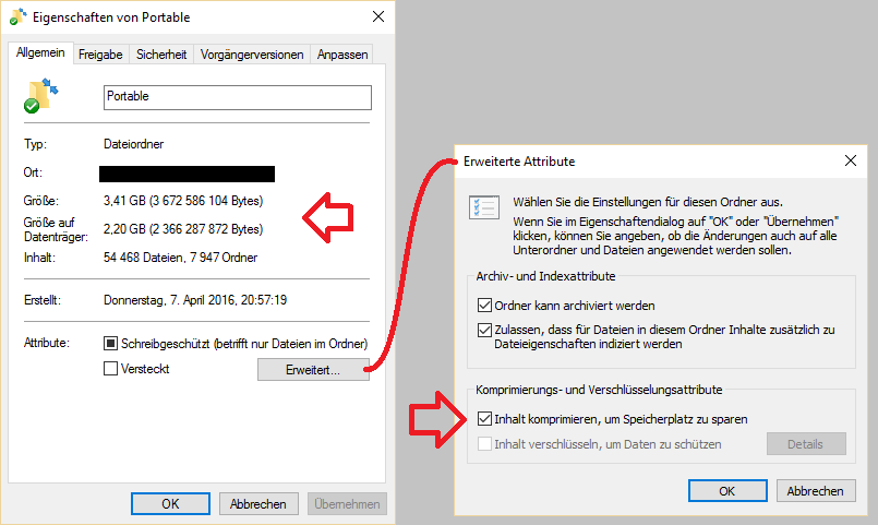 -> Dann ist die "Größe auf Datenträger" kleiner als die unkomprimierte normale "Größe"